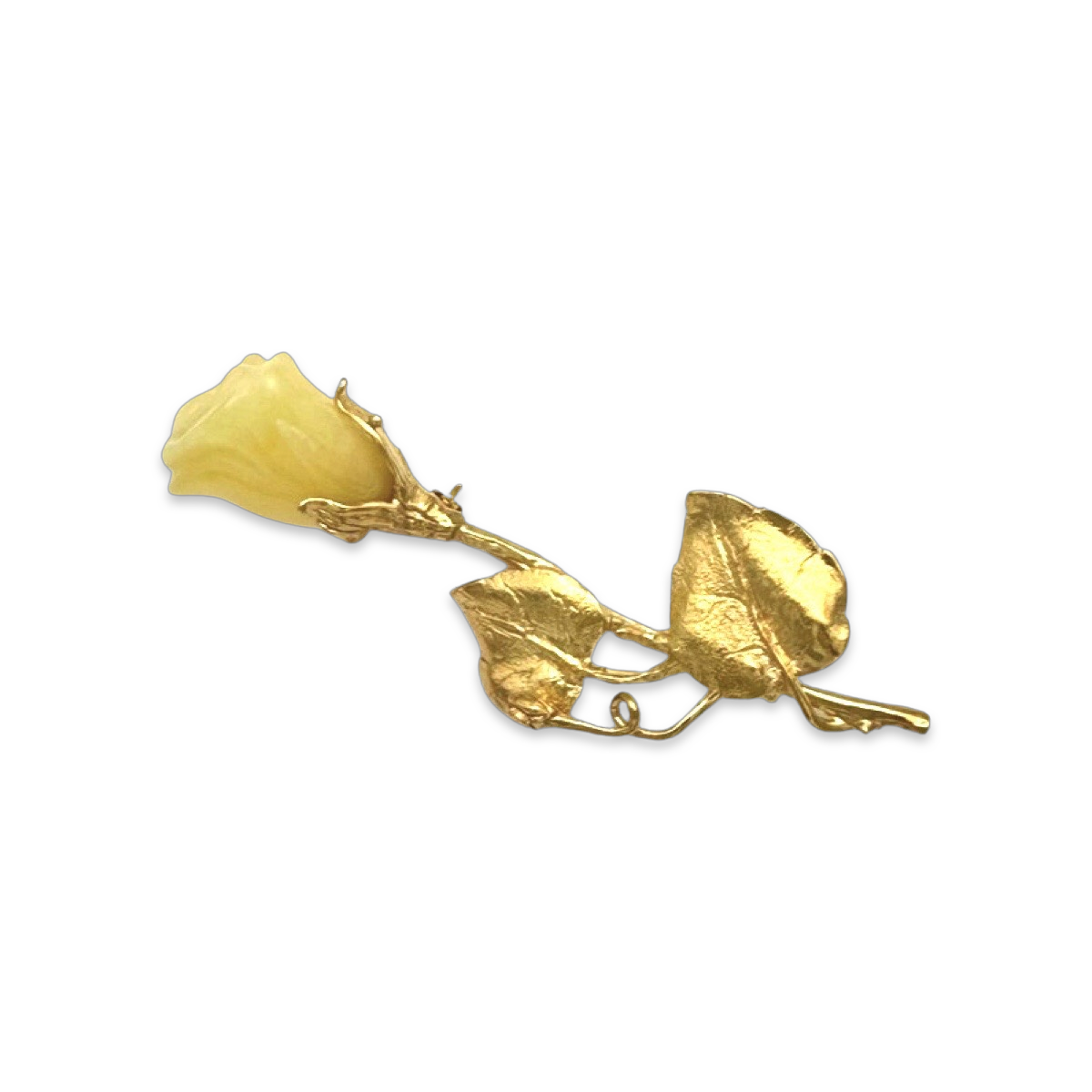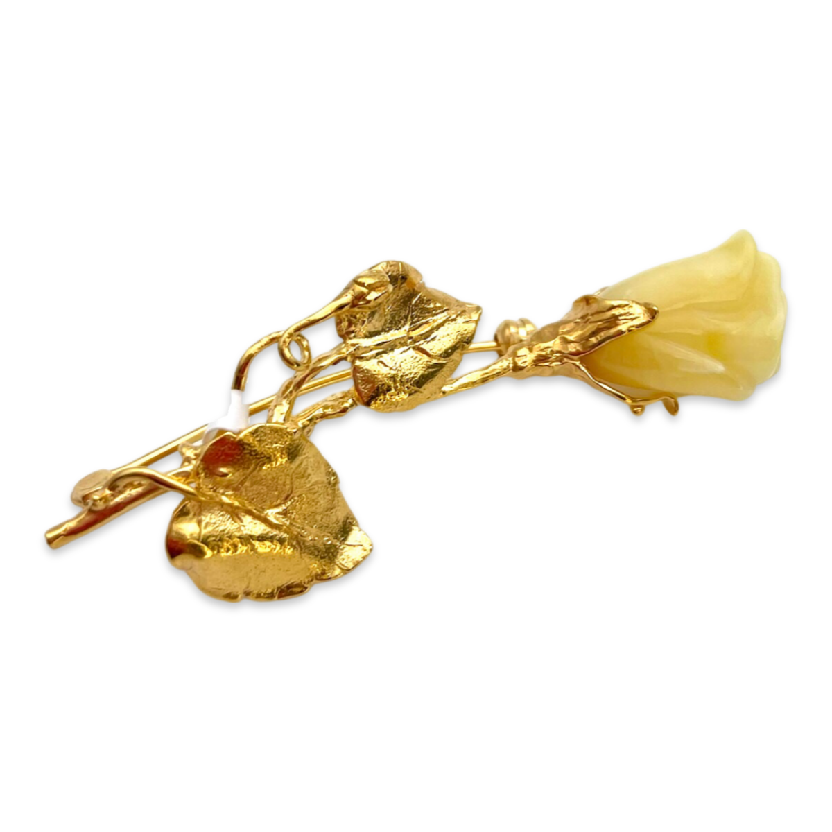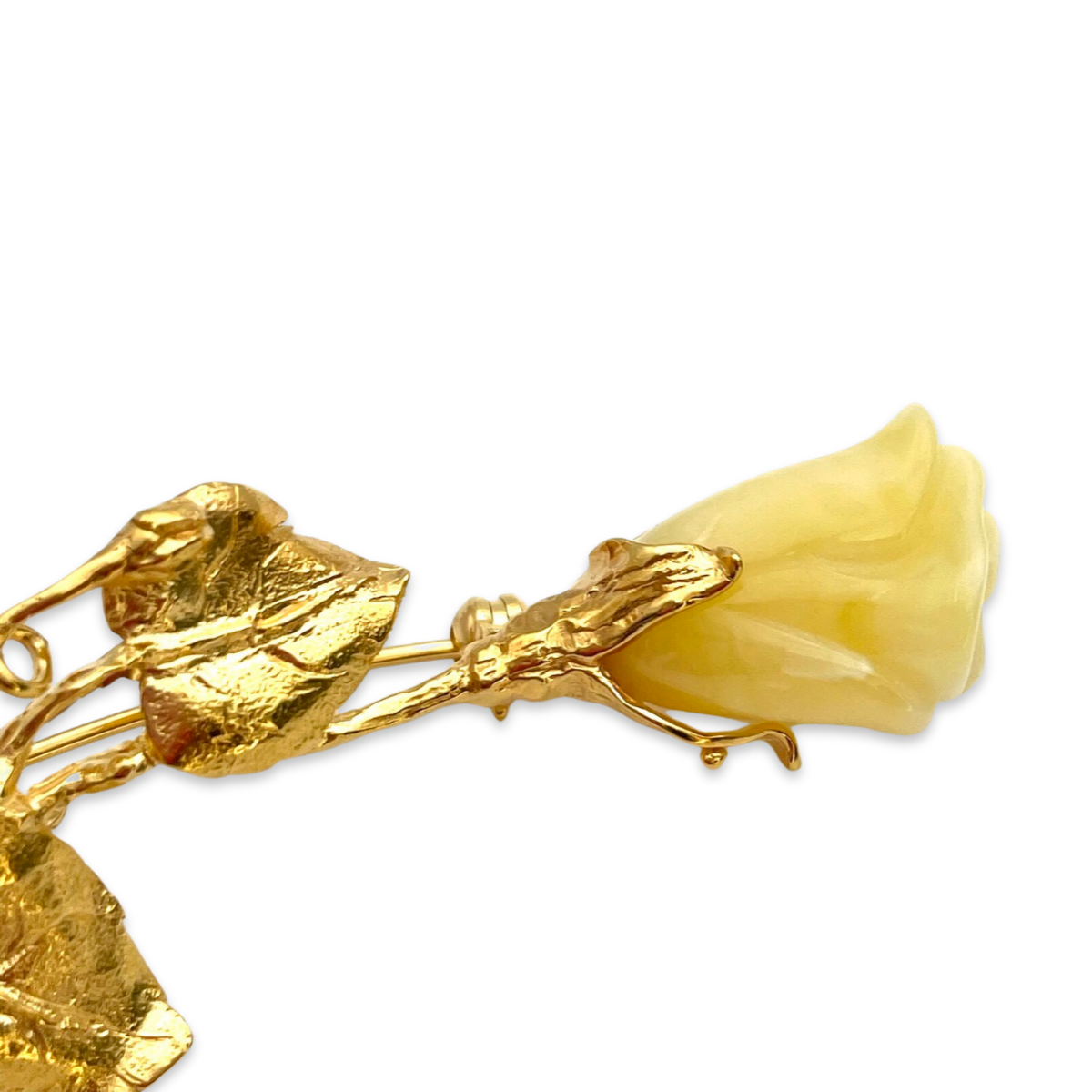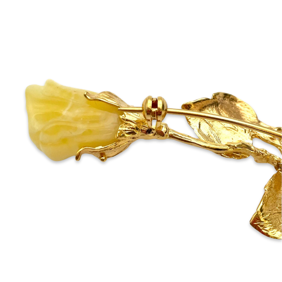 Die Brosche ist mit 24 Karat Gold plattiert, was ihr ein reiches und luxuriöses Aussehen verleiht. Das Herzstück der Brosche ist eine atemberaubende Bernsteinrose, die fachmännisch gefertigt wurde, um ihre natürliche Schönheit zu zeigen. Die Rose ist fein detailliert, wobei jedes Blütenblatt sorgfältig geformt und platziert wurde, um einen lebensechten Effekt zu erzielen.