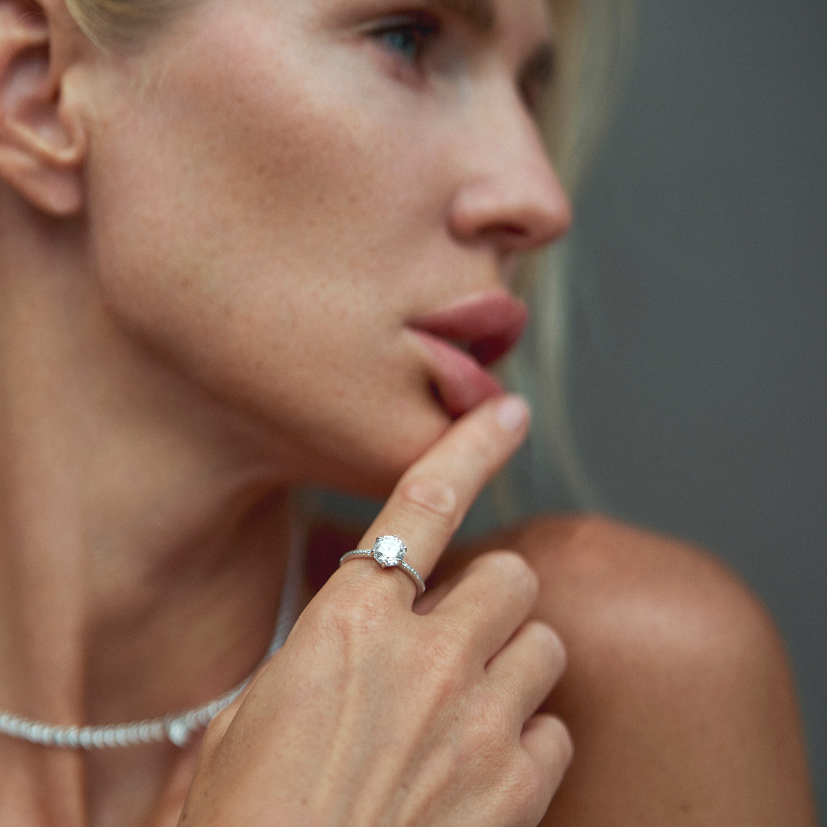 Die sanften Kurven des Silberbands verstärken die gesamte Anmut des Rings und bieten eine perfekte Fassung für den zentralen Zirkon. Jedes Detail ist sorgfältig durchdacht, wodurch dieser Verlobungsring nicht nur ein Symbol der Liebe, sondern auch ein zeitloses Accessoire ist, das den Modetrends standhält.
