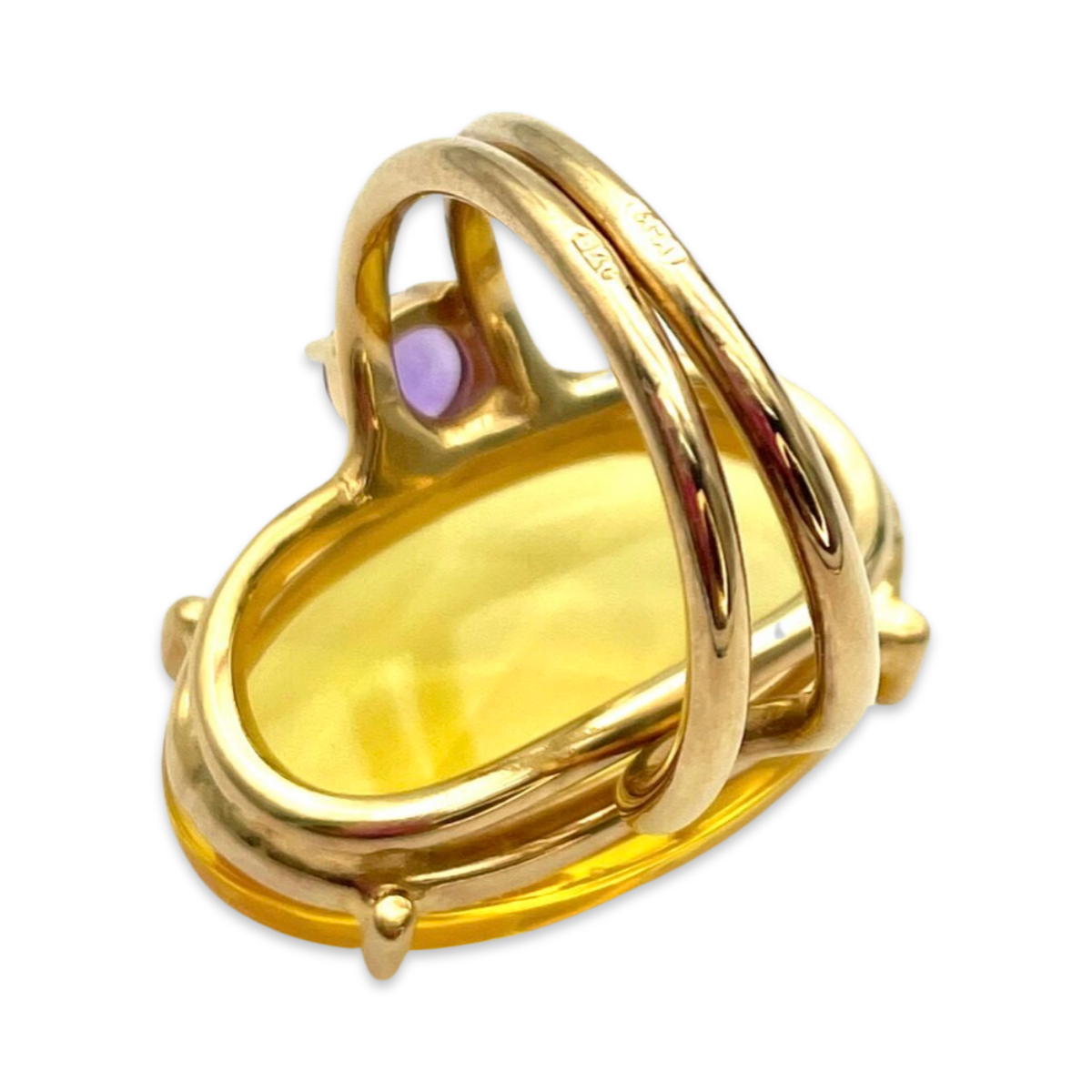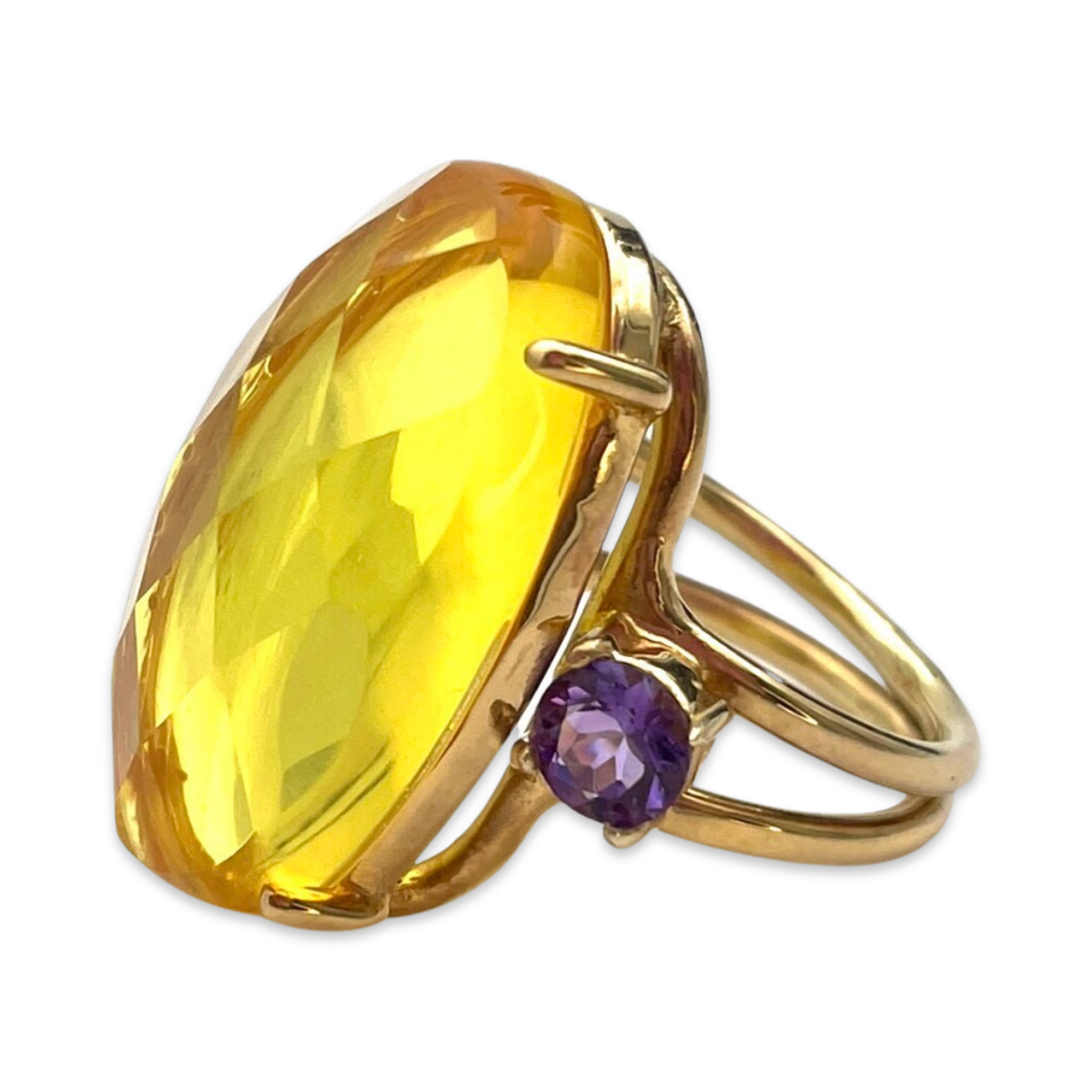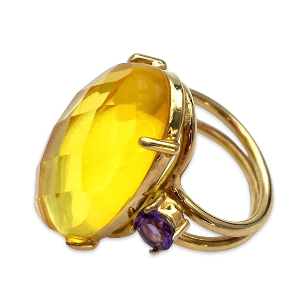 This gold-plated ring with faceted amber and amethyst is a stunning and unique accessory, available for purchase on our website. The ring features a high-quality gold plating 24k that adds a touch of luxury and elegance to the piece, and is adorned with a beautiful faceted amber stone and a small amethyst stone. The amber stone is smooth and easy to handle, and its warm, rich color is sure to complement any outfit. The purple amethyst stone adds an extra touch of color and charm to the piece, making it a true standout accessory. The ring also has a modern design that will complement any style, whether you're dressing up for a special occasion or adding some extra style to your everyday look. So why not add this gold-plated ring with faceted amber and amethyst to your jewelry collection today and make a bold and elegant statement!