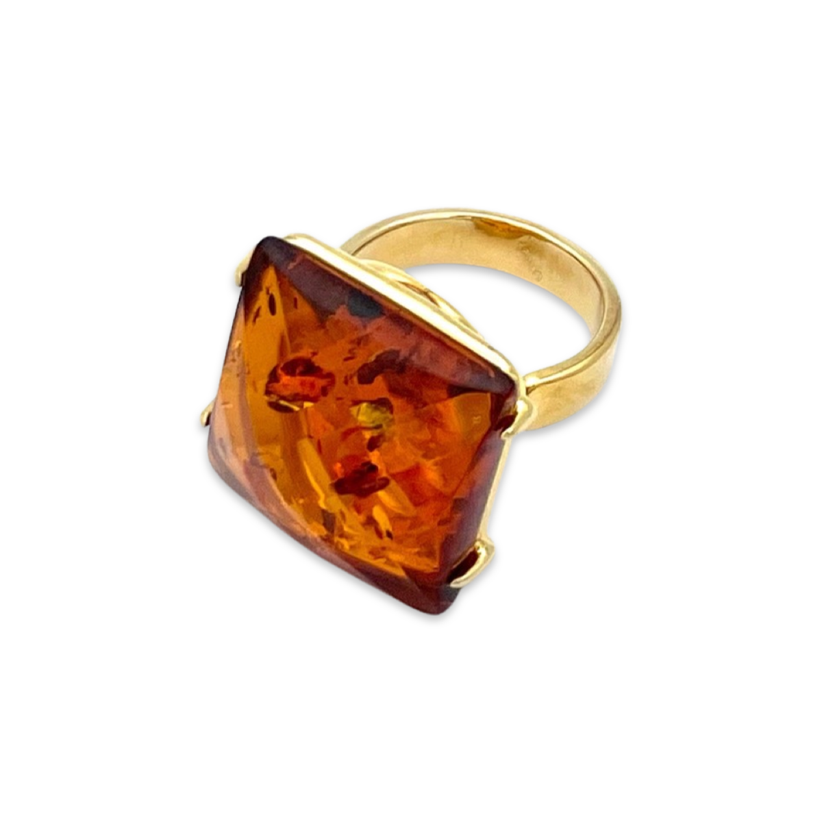 Introducing the stunning Gilded Ring with Faceted Amber from Amber Hats. This beautiful ring features a faceted amber stone, set in a high-quality gold-plated 24k band.The faceted cut of the amber stone creates a beautiful and unique play of light, enhancing the natural beauty of the stone. The warm tones of the amber stone also create a beautiful contrast to the gold-plated band, making this ring a perfect accessory for any outfit.The gold-plated band is not only stylish but also durable, ensuring that this ring will be a long-lasting addition to your jewelry collection. Each ring is handcrafted by skilled artisans, ensuring that no two pieces are exactly alike.This Gilded Ring with Faceted Amber is a beautiful and versatile piece of jewelry that can be worn on its own or stacked with other rings for a more dramatic effect.Order your Gilded Ring with Faceted Amber today and add a touch of elegance and sophistication to your jewelry collection.