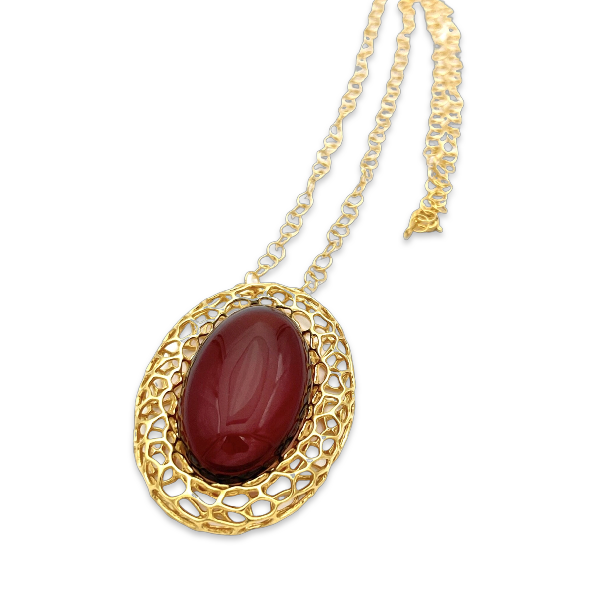 Das Herzstück der Halskette ist ein faszinierender roter Bernstein, der sorgfältig poliert wurde, um seine natürliche Schönheit zu zeigen. Der Stein hat eine tiefe und satte rote Farbe, die garantiert die Blicke auf sich zieht und jedem Outfit einen dramatischen Akzent verleiht.