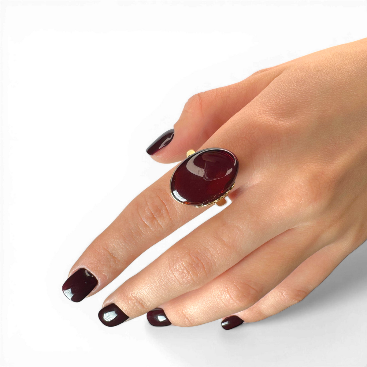Bold yet romantic. The deep cherry amber draws attention instantly, while the gold-plated setting adds a luxurious finish. This is your go-to piece when you want to stand out effortlessly — perfect with black, beige, or silk textures.