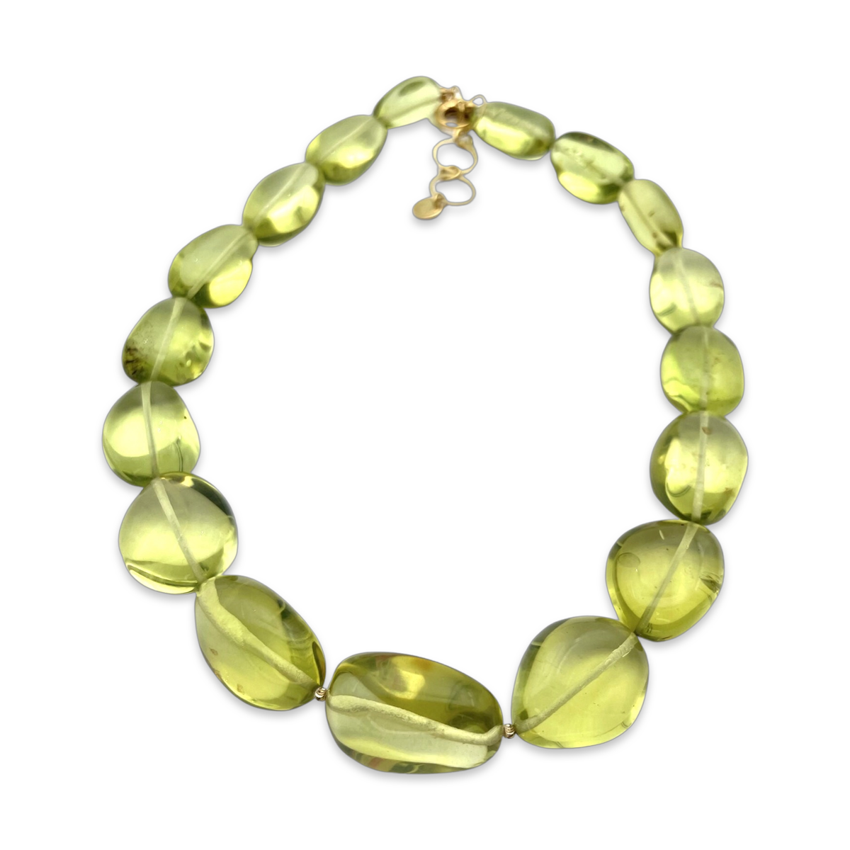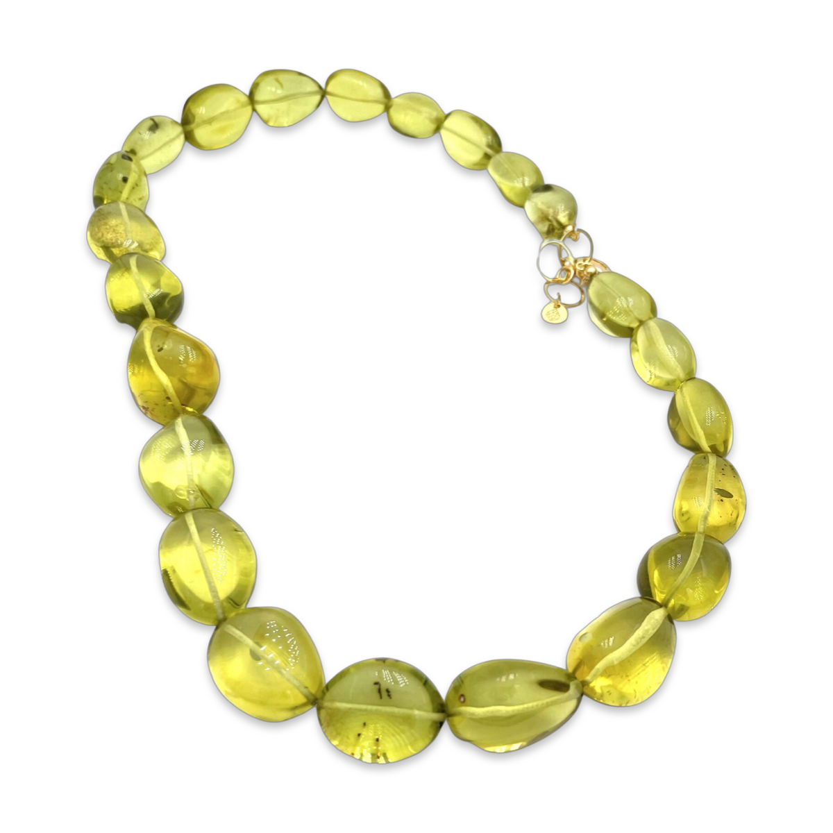 Diese wunderschöne Halskette besteht aus atemberaubenden grünen Bernsteinperlen, von denen jede in Form und Farbe einzigartig ist. Die Perlen werden sorgfältig von Hand ausgewählt und zu einem auffälligen Schmuckstück aufgereiht, das sowohl elegant als auch erdig ist. Der grüne Bernstein hat eine warme, organische Ausstrahlung, die jedem Outfit einen Hauch natürlicher Schönheit verleiht. Die Halskette ist so gestaltet, dass sie bequem am Hals anliegt, mit genau der richtigen Länge, um die Schönheit der Perlen zur Geltung zu bringen. Die Perlen sind in der Größe abgestuft, wobei die größeren in der Mitte der Halskette sitzen und so einen schmeichelhaften und auffälligen Effekt erzeugen. Die Halskette ist mit einem sicheren, goldbeschichteten Verschluss versehen, der dafür sorgt, dass sie den ganzen Tag an ihrem Platz bleibt. Diese Halskette mit grünen Bernsteinperlen ist perfekt für alle, die natürliche Edelsteine lieben und ihrer Schmucksammlung einen Hauch organischer Schönheit hinzufügen möchten. Sie ist ein tolles Geschenk für einen geliebten Menschen oder einen besonderen Anlass und wird mit Sicherheit über viele Jahre geschätzt werden.