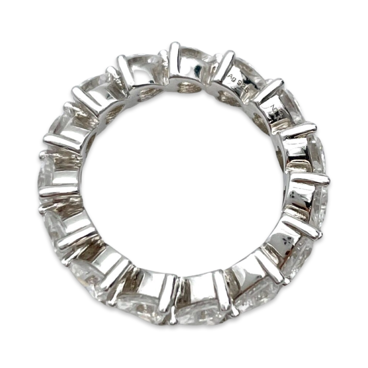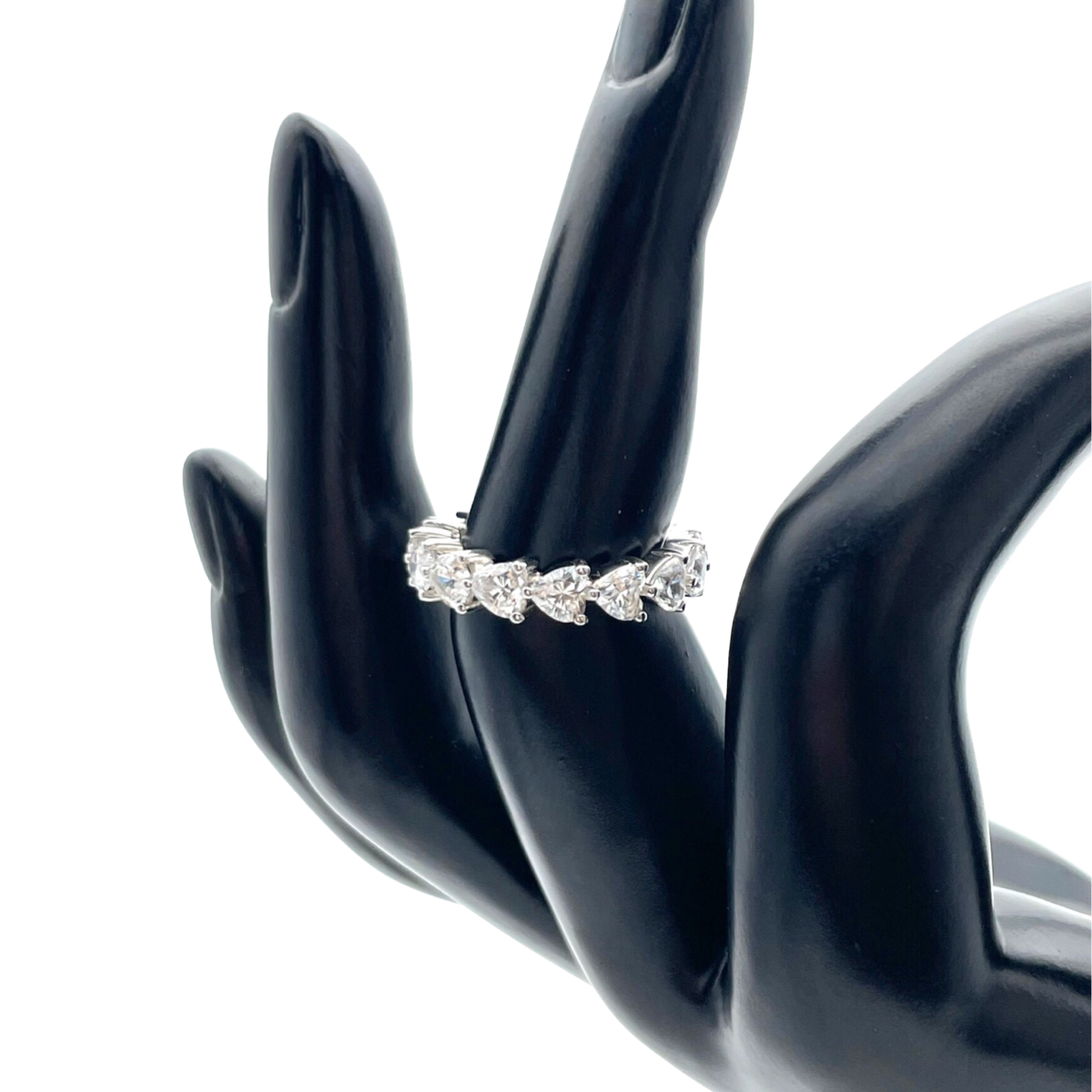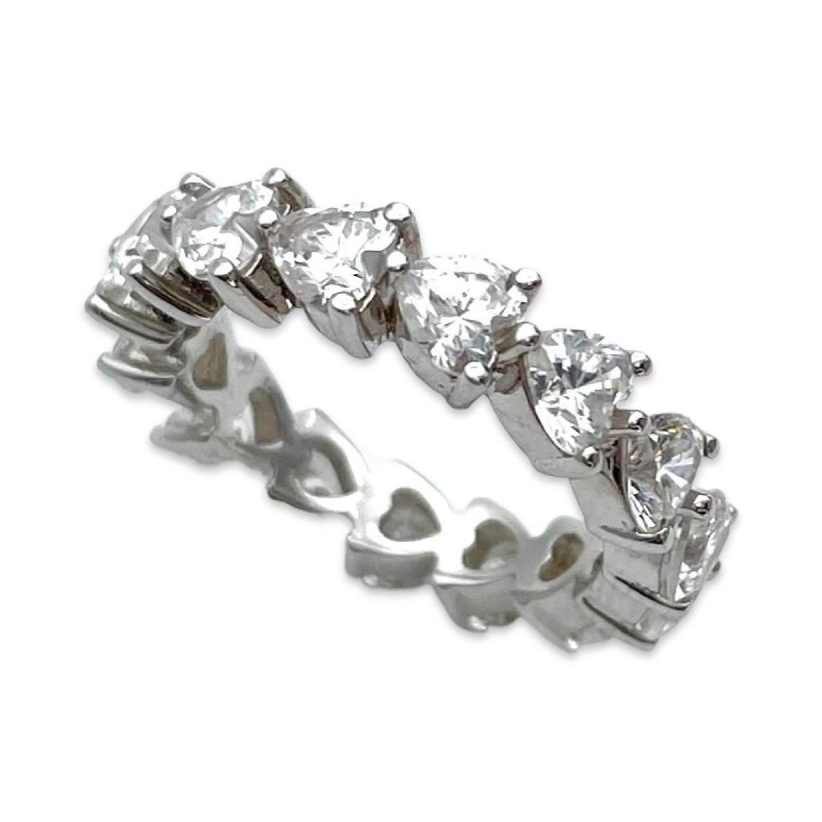 Gefertigt aus hochwertigem Sterlingsilber zeigt das Band des Rings eine Reihe wunderschön detaillierter Herzen, jedes geschmückt mit glänzenden weißen Zirkonen. Die Zirkone sind sorgfältig gefasst, was ein brillantes Lichtspiel gewährleistet und dem Design einen Hauch von Glamour verleiht.