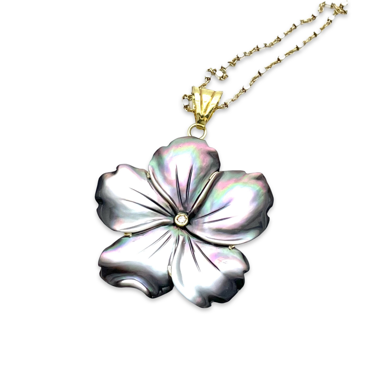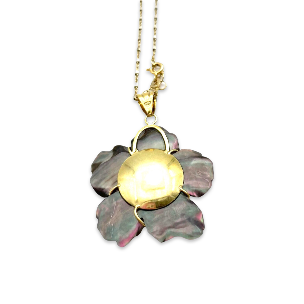This gold-plated necklace features a beautiful, dark mother-of-pearl pendant in the shape of a flower. The pendant is intricately designed and has a natural shimmering effect that catches the light beautifully. The necklace itself is made from high-quality materials, and the gold plating 24k adds an extra touch of elegance and sophistication. The necklace is a perfect accessory for a formal occasion or for adding a touch of glamour to your everyday look. With its timeless design and high-quality craftsmanship, this necklace is sure to become a treasured piece in your jewelry collection.
