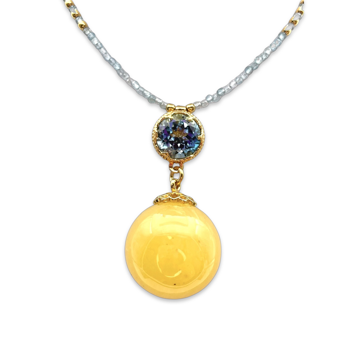 Diese exquisite Halskette besticht durch eine atemberaubende Kombination aus einer goldenen Bernsteinperle und einem schimmernden Topas-Edelstein. Die natürliche Schönheit des Bernsteins und der Glanz des Topas werden durch das filigrane Design der Halskette perfekt ergänzt, was sie zu einem wirklich einzigartigen Schmuckstück macht.