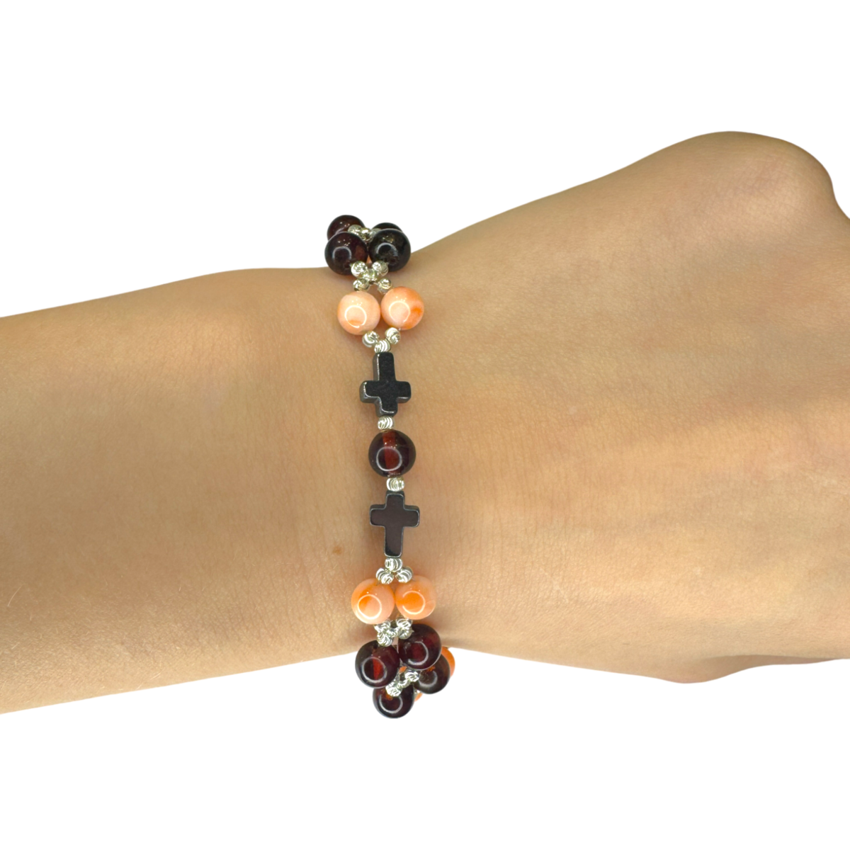 Ein raffiniertes Armband mit weichem rosa Koralle, reichhaltigem Kirschbernstein und schlankem Hämatit, veredelt mit eleganten Silberdetails. Der ausgewogene Kontrast aus warmen Tönen und subtiler Glanz schafft ein modernes, aber zeitloses Statement. Verstellbar für eine perfekte Passform, ausdrucksstark und mühelos elegant — entworfen, um den Alltagsstil mit natürlicher Eleganz zu heben.