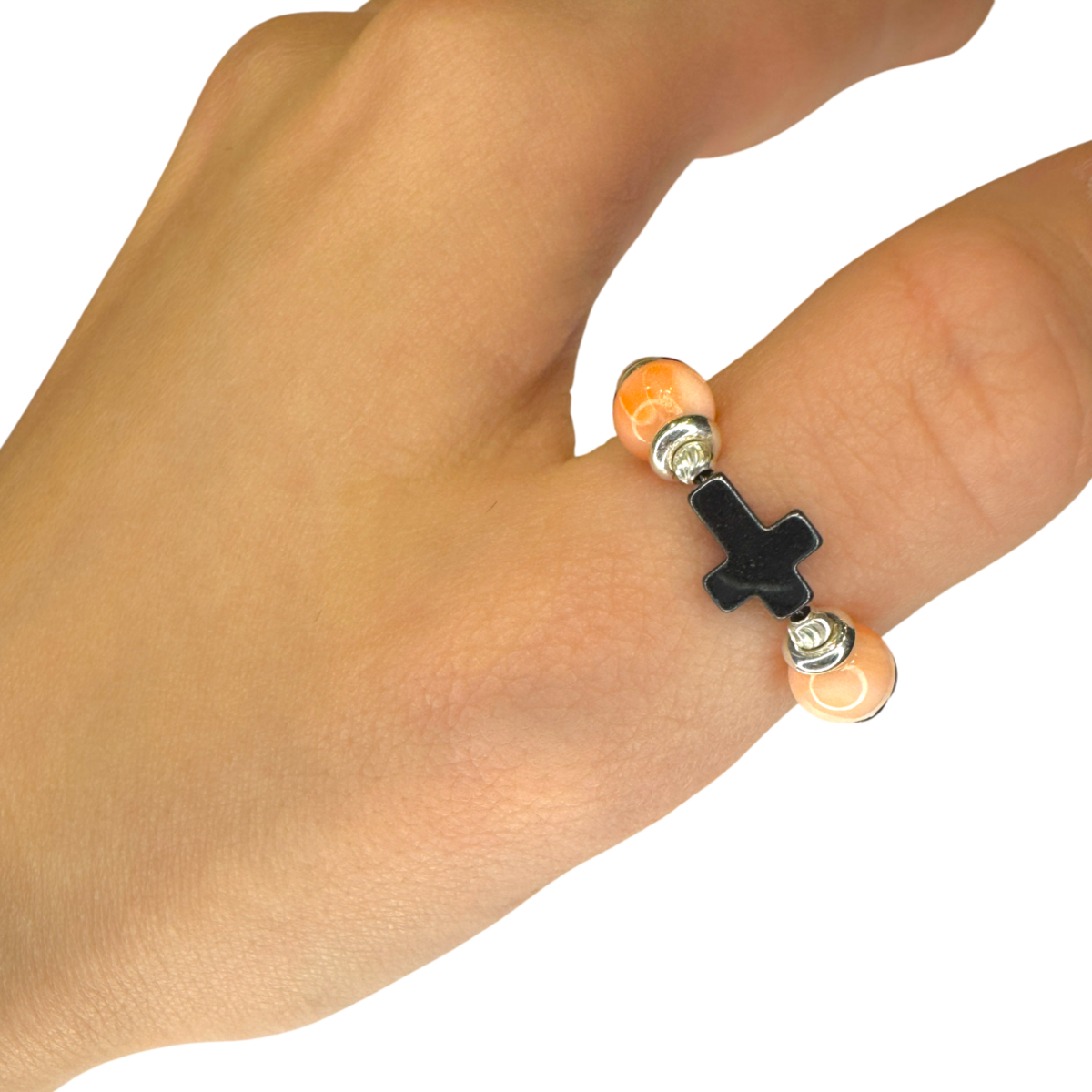 Ein verfeinerter Ring mit sanftem rosa Korallen, reichhaltigem Kirschbernstein und elegantem Hämatit, veredelt mit eleganten Silberdetails. Der ausgewogene Kontrast aus warmen Tönen und subtiler Glanz schafft ein modernes und zugleich zeitloses Statement. Ausdrucksstark, raffiniert und mühelos schick – perfekt, um sowohl Alltags- als auch festliche Looks zu veredeln.