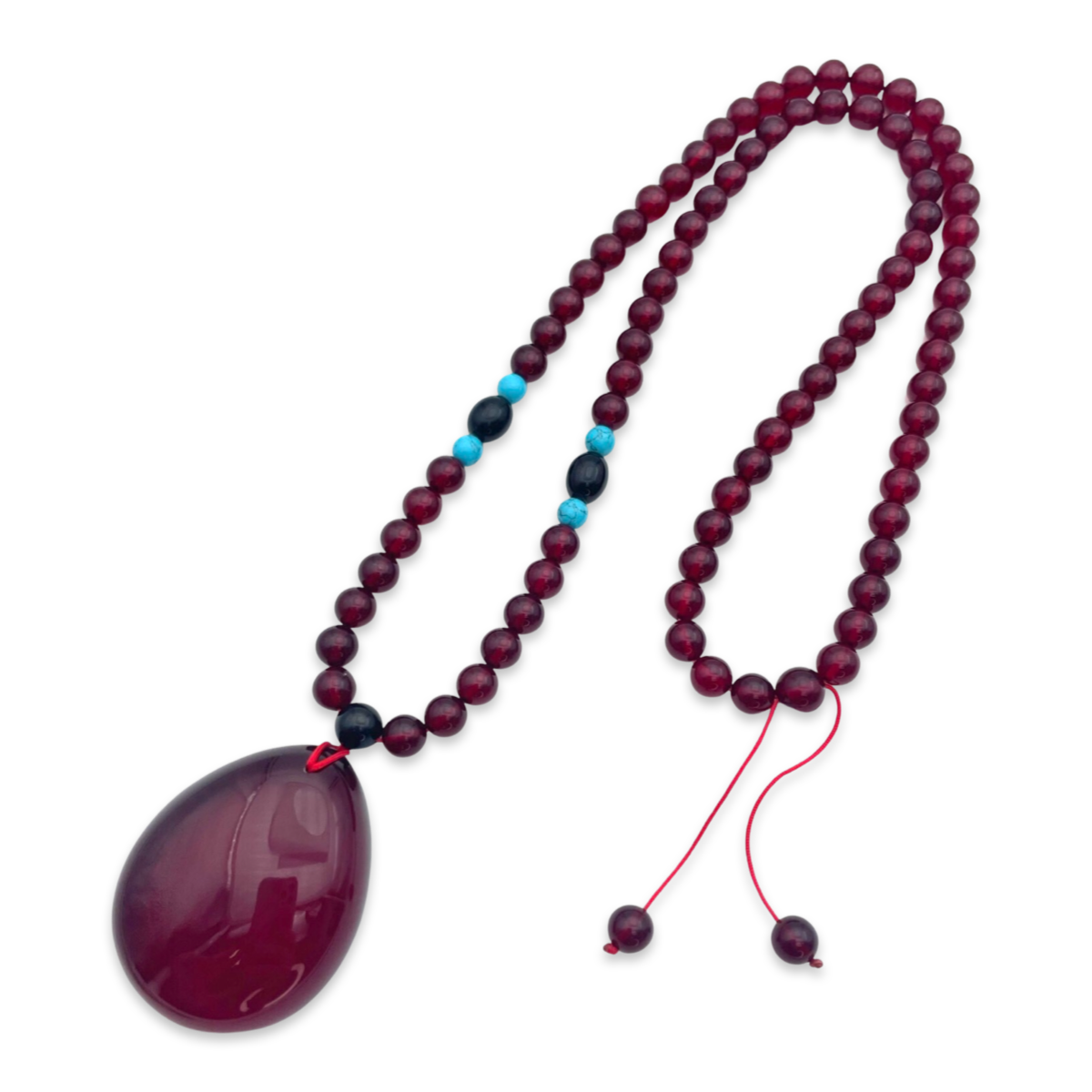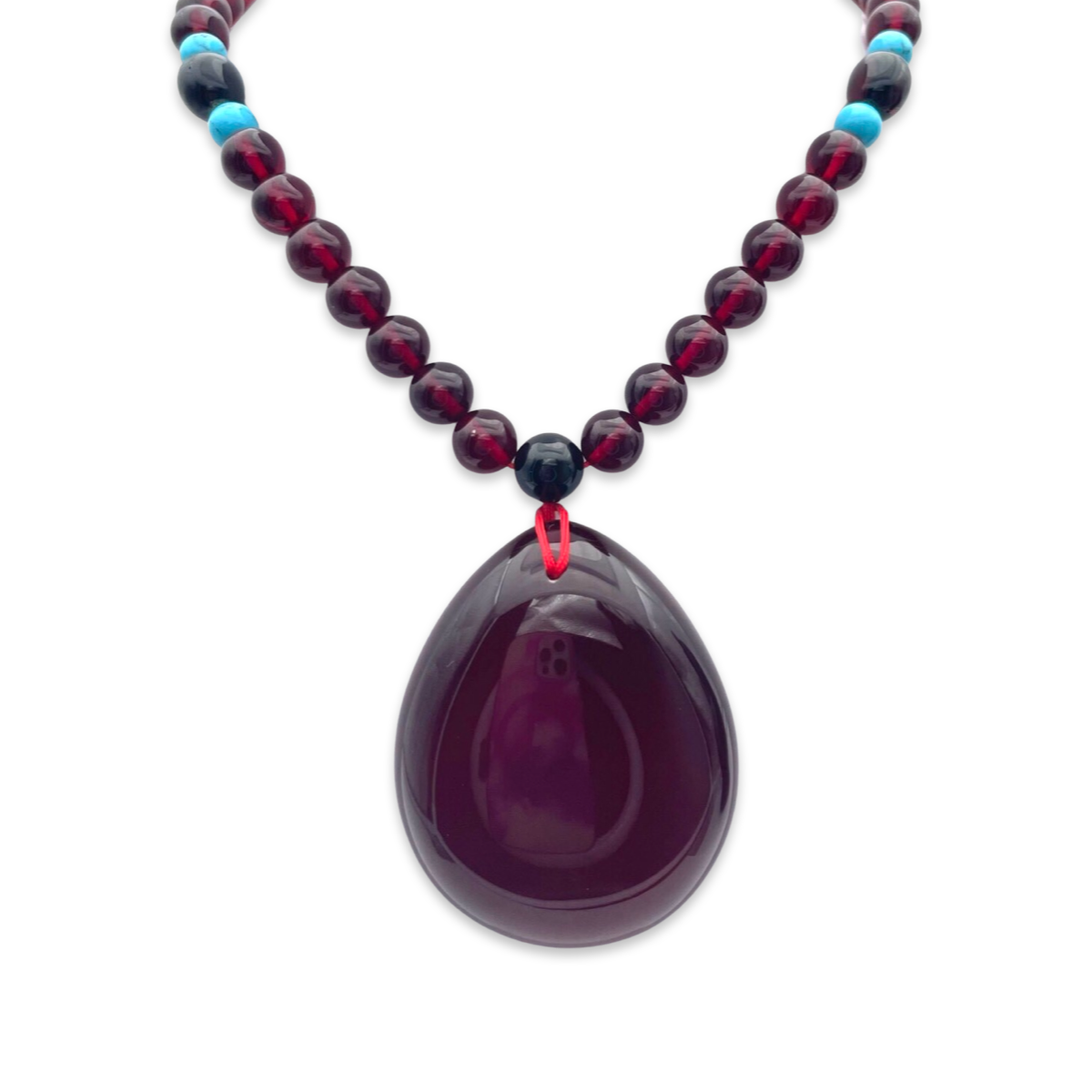 Dieser rote Bernstein-Anhänger mit Bernstein-Kugelperlen ist ein atemberaubendes Schmuckstück, das sicherlich Aufmerksamkeit erregen wird. Der Anhänger verfügt über einen großen, tropfenförmigen roten Bernstein als Mittelpunkt. Der rote Bernstein ist ein natürlicher Edelstein, der für seine warme, rötlich-braune Farbe und seine einzigartigen Einschlüsse geschätzt wird. Die kleineren Bernsteinperlen verleihen dem Stück Textur und Interesse und schaffen ein kohärentes und auffälliges Design. Das Design des Anhängers ist einfach, aber elegant und lässt die Schönheit des roten Bernsteins und der Bernstein-Kugelperlen zur Geltung kommen. Ob als Geschenk oder als persönliches Accessoire getragen, dieser rote Bernstein-Anhänger mit Bernstein-Kugelperlen wird sicherlich ein Statement setzen und jedem Outfit Originalität verleihen.