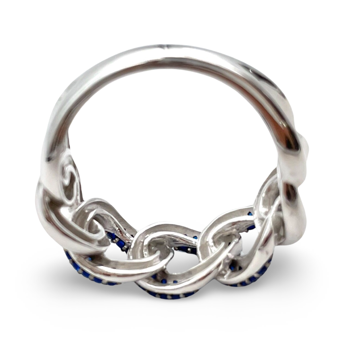 Gönnen Sie sich die zeitlose Eleganz des silbernen geflochtenen Rings mit blauen Kristallen und lassen Sie ihn Ihre Hand mit seinem faszinierenden Charme schmücken.