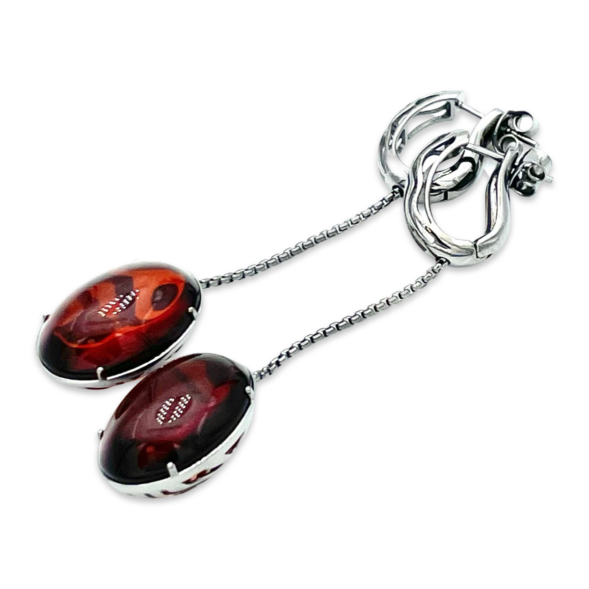 Diese atemberaubenden Silberohrringe sind mit rotem Bernstein verziert und sorgen für ein kühnes und auffälliges Accessoire. Die natürlichen Bernsteinsteine werden sorgfältig für ihre lebendige Farbe und einzigartigen Muster ausgewählt und verleihen dem eleganten Design eine Note natürlicher Schönheit. Hergestellt aus hochwertigem 925er Sterlingsilber sind diese Ohrringe langlebig und langlebig und somit die perfekte Ergänzung für jede Schmucksammlung. Das Silber ergänzt den Bernstein perfekt und schafft einen zeitlosen und anspruchsvollen Look, der mit einer Vielzahl von Outfits getragen werden kann. Die Ohrringe sind einfach zu tragen, mit einer Befestigung, die sicherstellt, dass sie den ganzen Tag über sicher an ihrem Platz bleiben. Das leichte Design sorgt auch dafür, dass sie über längere Zeiträume bequem zu tragen sind und somit ein ideales Accessoire für jeden Anlass darstellen. Egal, ob Sie ein Geschenk für einen geliebten Menschen suchen oder sich einfach selbst mit einem schönen neuen Schmuckstück verwöhnen möchten, diese Silberohrringe mit rotem Bernstein werden sicherlich beeindrucken. Mit ihrem atemberaubenden Design und hochwertigen Materialien sind sie ein wahres Investmentstück, das jahrelang geschätzt wird.