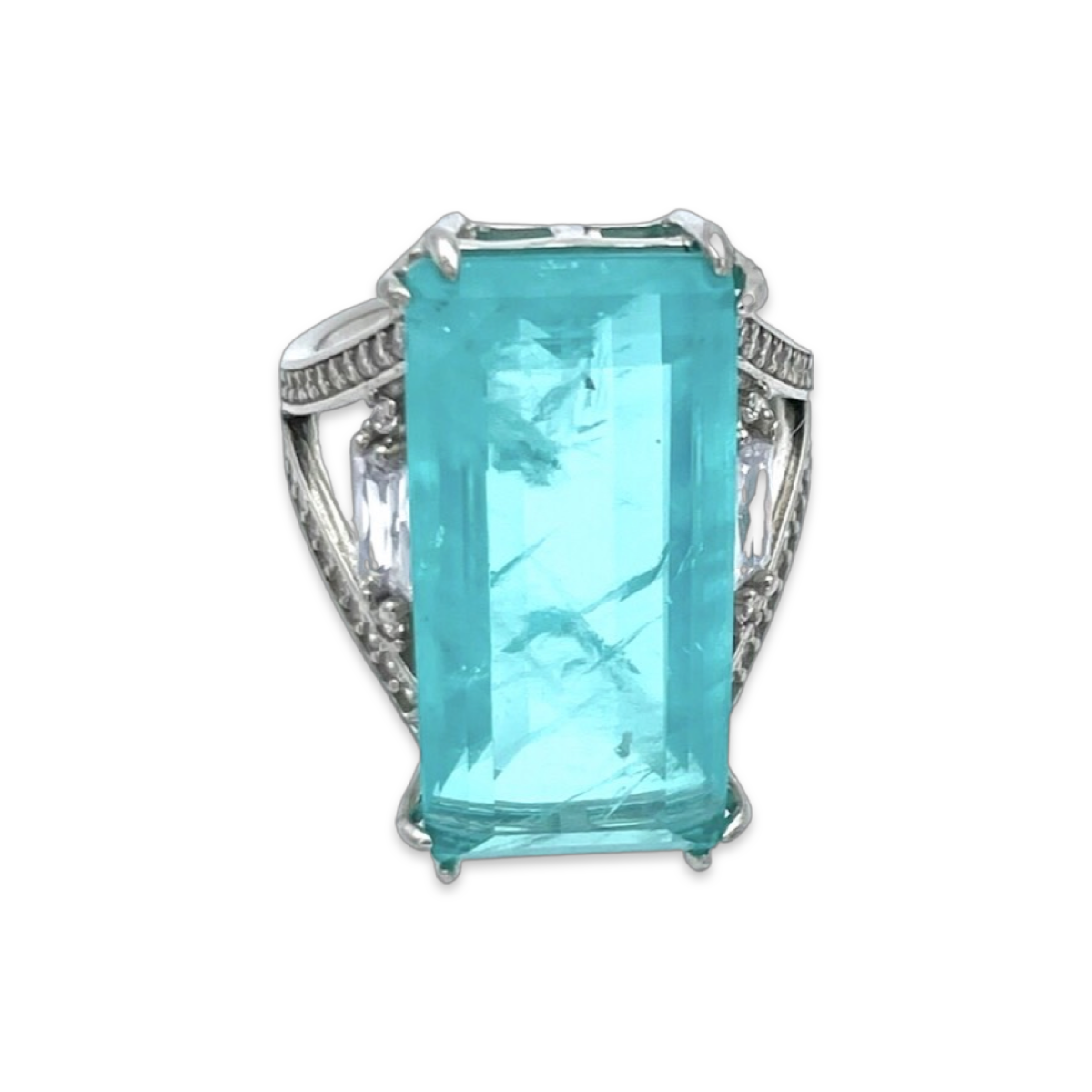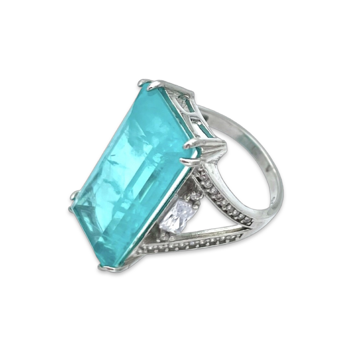 Dieser Silberring mit Paraiba und Zirkonen ist ein atemberaubendes Schmuckstück, das garantiert alle Blicke auf sich zieht. Der Ring verfügt über einen wunderschönen Paraiba-Stein in der Mitte, der für seine einzigartige blau-grüne Farbe und außergewöhnliche Klarheit geschätzt wird.