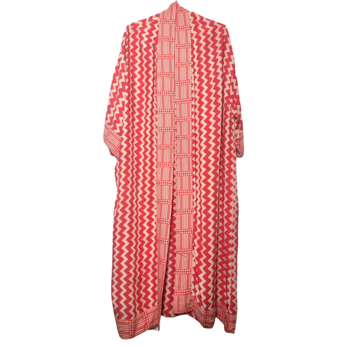 The red and white pattern is bold and eye-catching, adding a pop of color to any outfit. The design is versatile and can be paired with a wide range of colors and styles, making it easy to incorporate into your existing wardrobe. The kimono also features a comfortable fit that is suitable for a range of body types, with a flowing silhouette that flatters every figure.