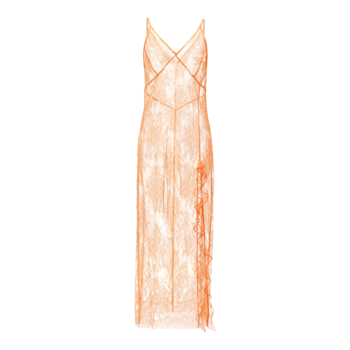 Una expresión vibrante de feminidad y la facilidad del verano, este vestido largo de encaje naranja es llamativo y a la vez elegantemente sencillo. Confeccionado con delicados detalles de encaje, ofrece una silueta romántica que se mueve maravillosamente con cada paso.