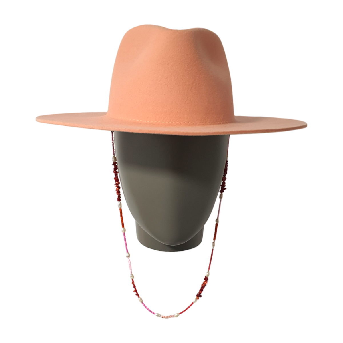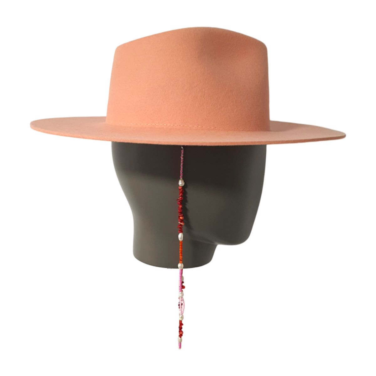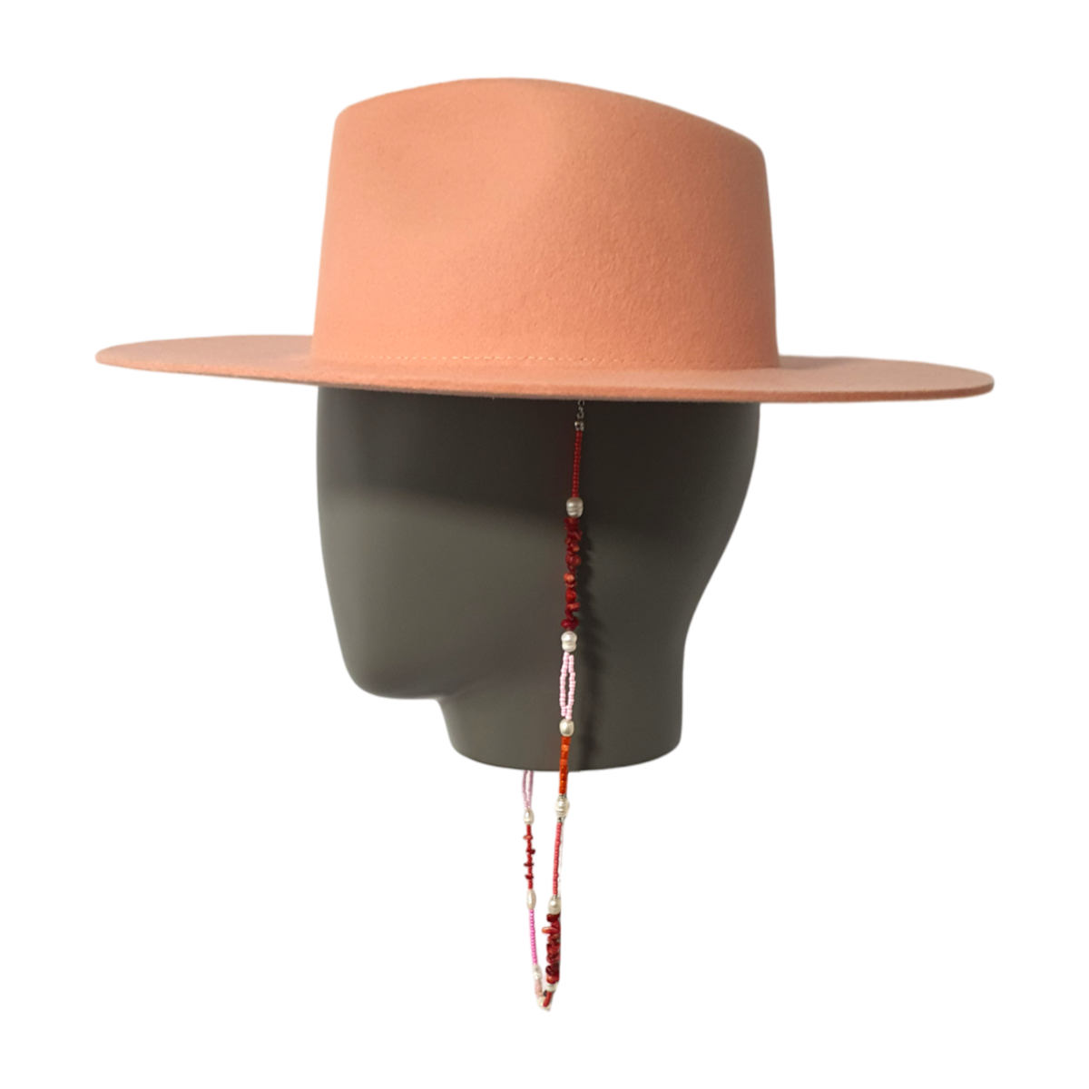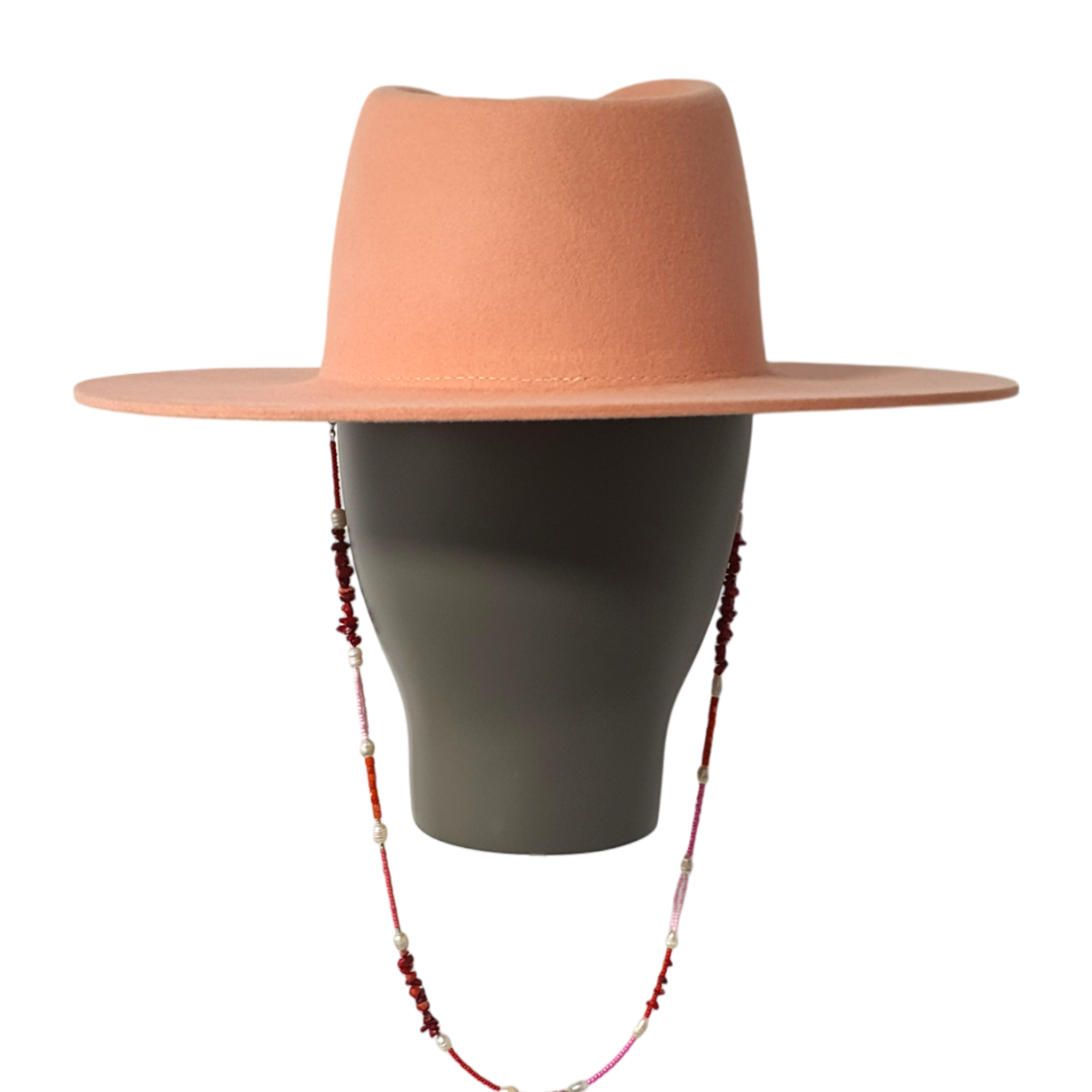 Este sombrero color coral cuenta con un hilo de cuentas removible, que te permite alternar entre una elegancia minimalista y un look más adornado. Cuidadosamente moldeado a mano en Portugal, encarna la artesanía y la versatilidad.