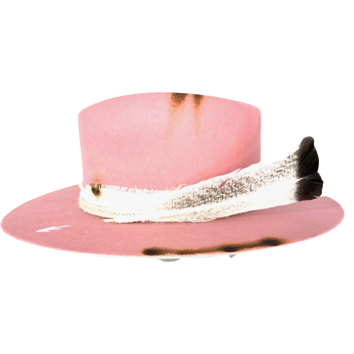 The feather detail on this hat is a beautiful accent that adds a touch of sophistication to the design. The feather is a natural white color and is placed on the side of the hat, creating a unique and eye-catching look.