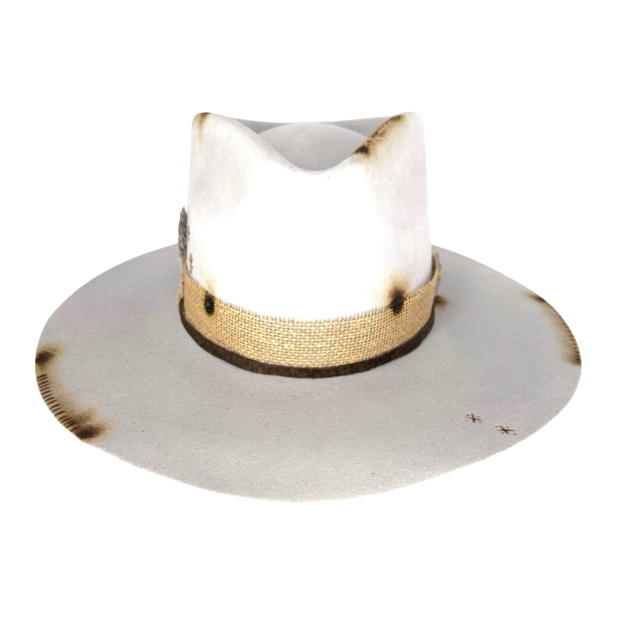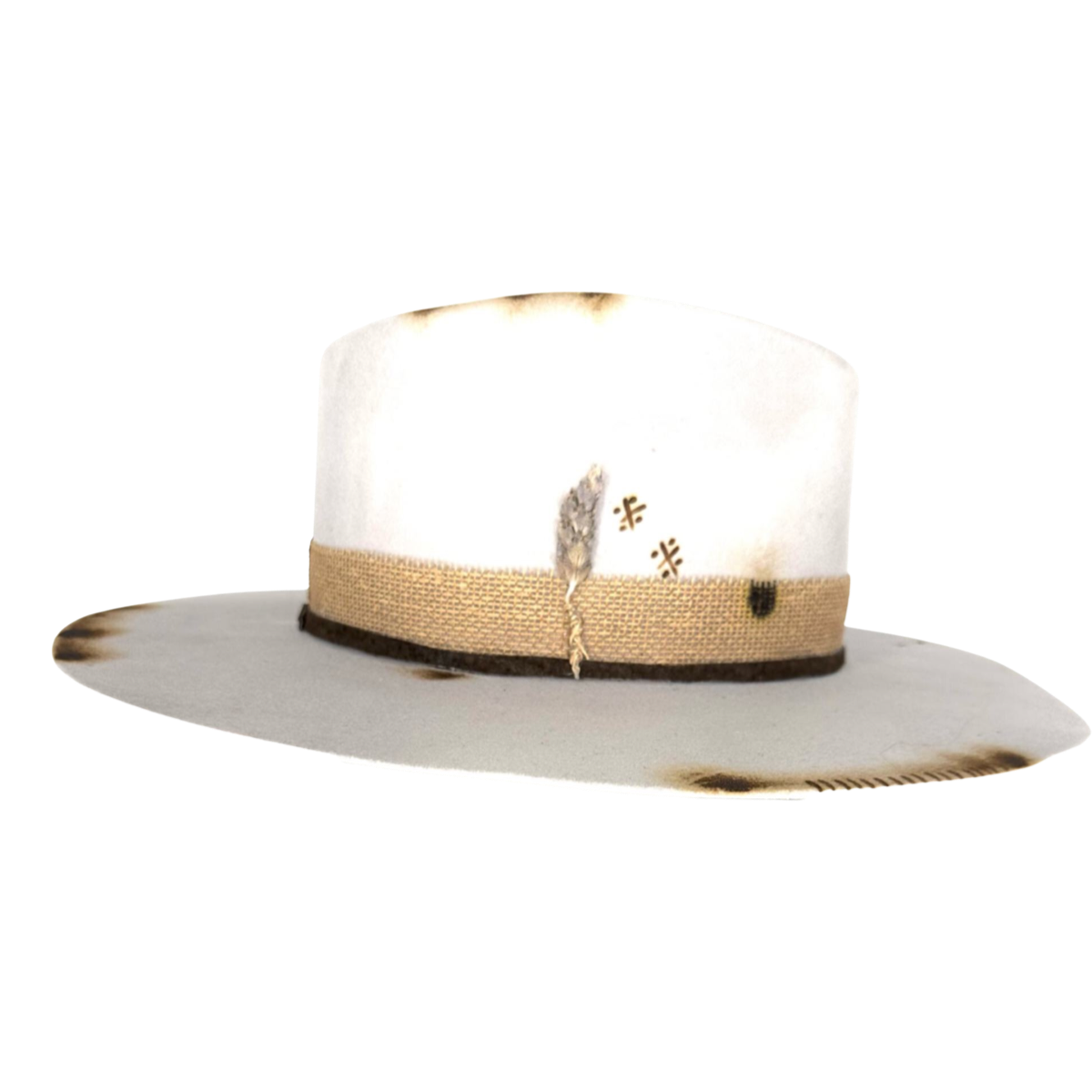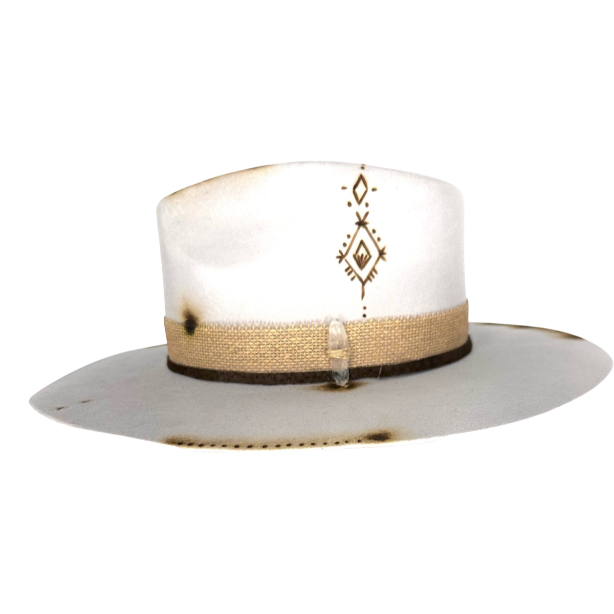 The subtle light color of the hat is understated and sophisticated, while the small stone and hieroglyph embellishment adds a unique and intriguing element to the design. The stone and hieroglyph are securely attached to the hat and add a touch of texture and interest.