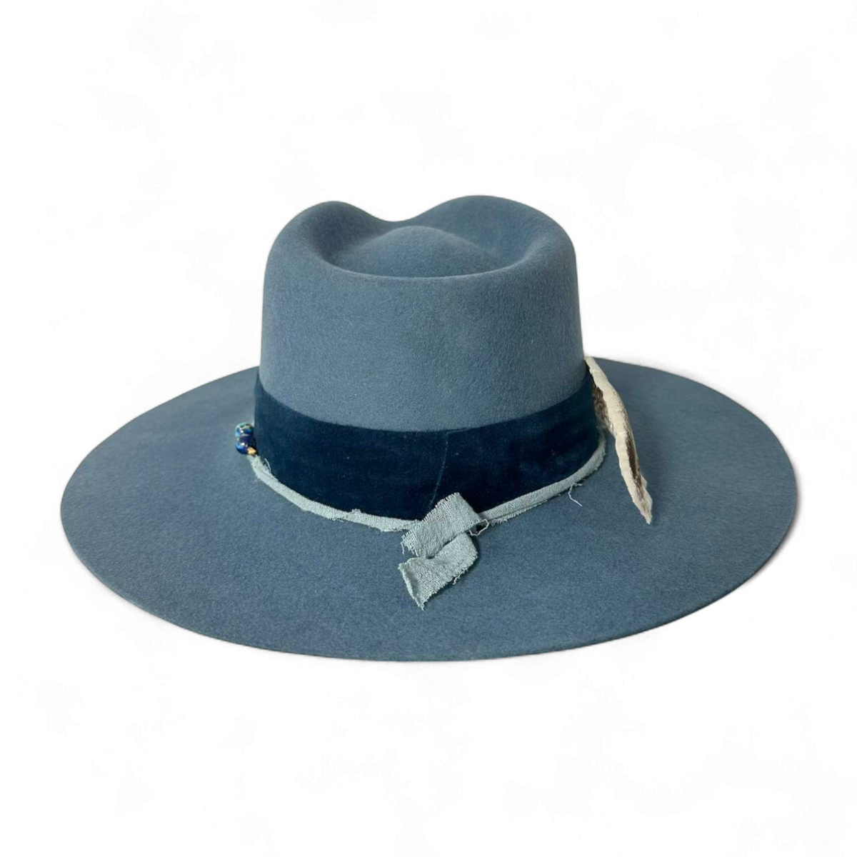 Un accesorio refinado y atemporal, este sombrero de fina lana en azul océano profundo se realza con detalles lujosos y naturales, creando un look que es a la vez elegante y único.