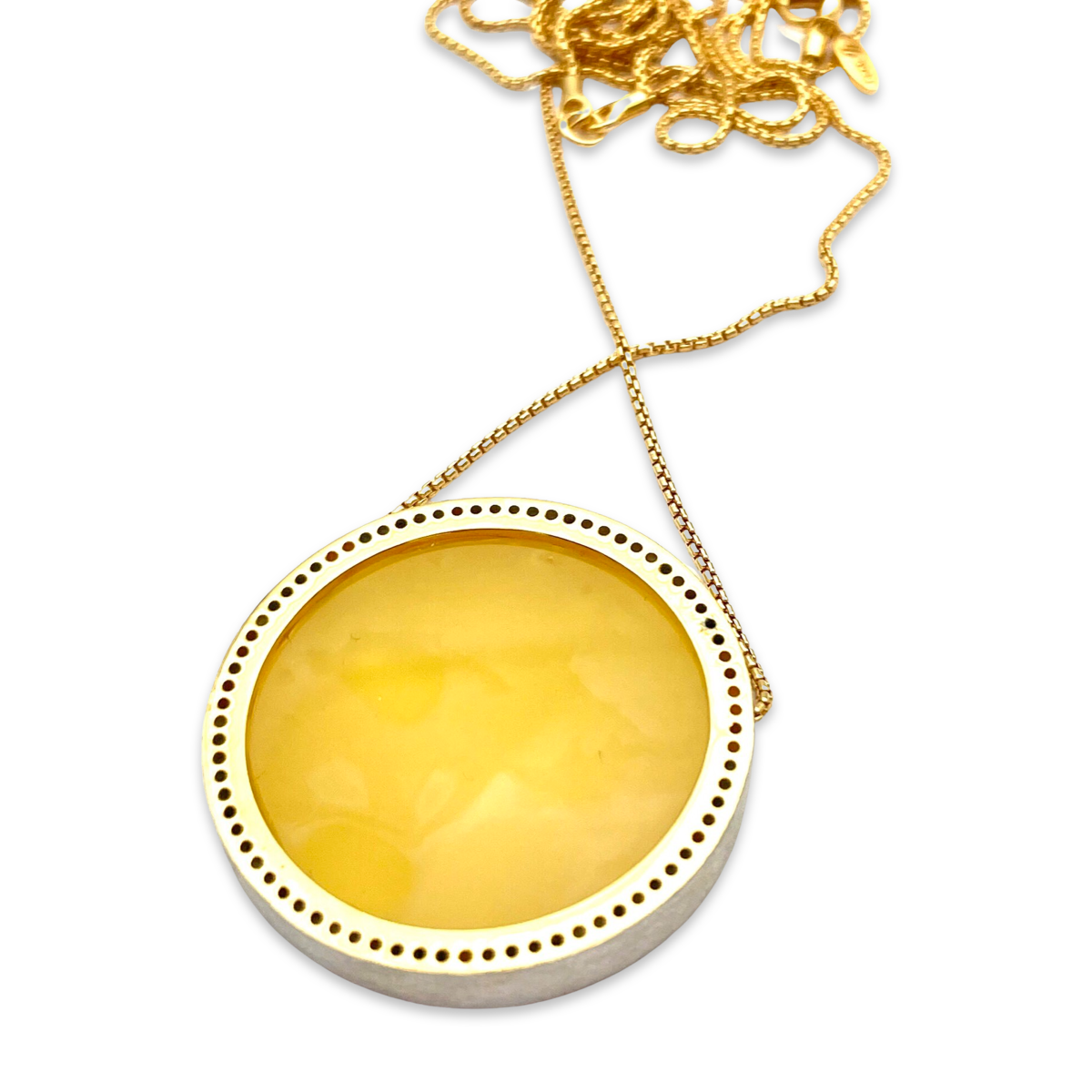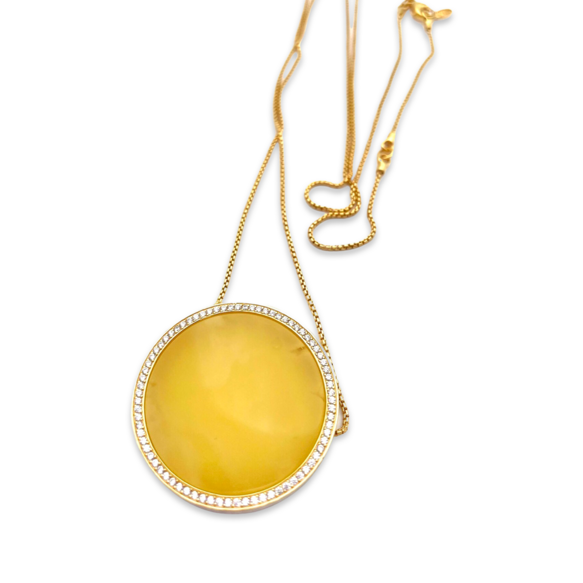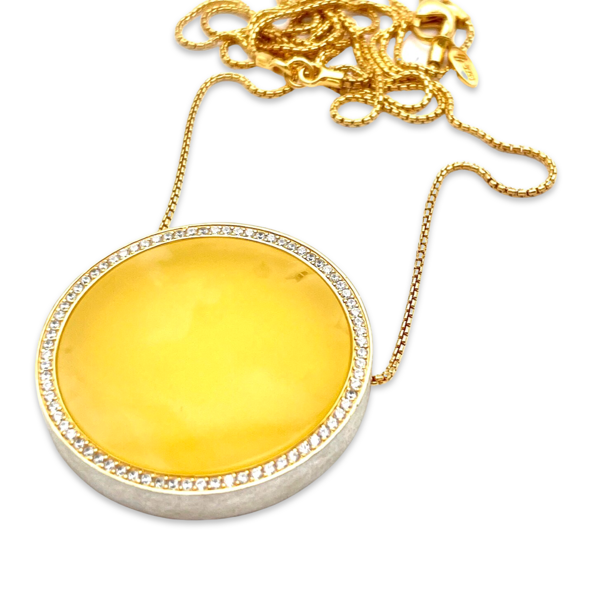 Este exquisito collar chapado en oro es una verdadera pieza de declaración, que presenta una impresionante combinación de ámbar natural y circonitas brillantes. El tono cálido y color miel del ámbar se complementa maravillosamente con las circonitas brillantes y relucientes, creando un contraste sofisticado y elegante. El collar está elaborado con plata de alta calidad con baño de oro, lo que garantiza durabilidad y longevidad, mientras que el engaste intrincado muestra la belleza de las piedras preciosas. El collar está diseñado para reposar con gracia en el escote, lo que lo hace perfecto para añadir un toque de glamour a cualquier atuendo. Ya sea que te estés vistiendo para una ocasión especial o simplemente busques elevar tu look diario, este collar chapado en oro con ámbar y circonitas seguramente llamará la atención.