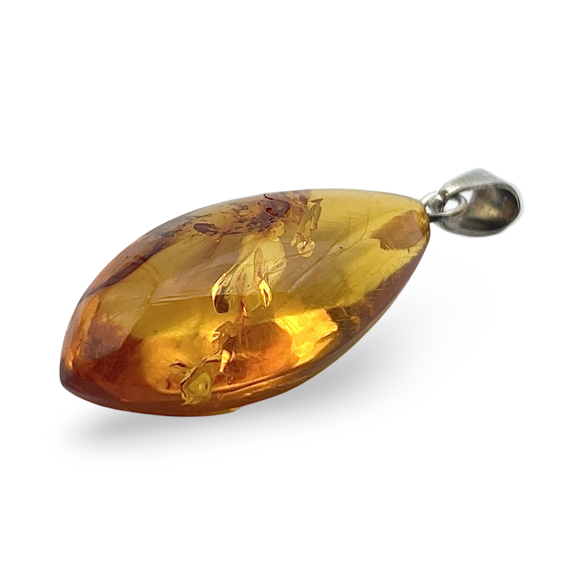 Nuestro colgante de piedra de ámbar pulido es un testimonio del atractivo natural del ámbar, a menudo llamado el "Oro del Báltico." Cada piedra de ámbar se selecciona cuidadosamente por sus inclusiones únicas y tonos ricos, y luego se pule expertamente para resaltar su belleza inherente. La superficie lisa y la forma orgánica de la piedra de ámbar hacen que cada colgante sea verdaderamente único. El colgante está complementado por un elegante ojete de plata para colgar, que proporciona una forma duradera y elegante de sujetar el colgante a tu cadena o cordón favorito. El contraste entre el cálido ámbar y la fría plata añade un toque de sofisticación y modernidad a esta pieza atemporal. El ámbar ha sido apreciado durante siglos no solo por su belleza, sino también por sus supuestas propiedades curativas. Llevar este colgante no solo realza tu estilo, sino que también te conecta con la historia antigua y la calidez natural de esta notable piedra preciosa. Instrucciones de cuidado: Para mantener la belleza y el brillo de tu colgante de ámbar, límpialo suavemente con un paño suave y evita la exposición a productos químicos agresivos o temperaturas extremas. Guárdalo en un lugar fresco y seco cuando no lo uses para preservar sus propiedades naturales. Perfecto como un regalo considerado o un capricho personal, este colgante seguramente se convertirá en una adición apreciada a cualquier colección de joyas.