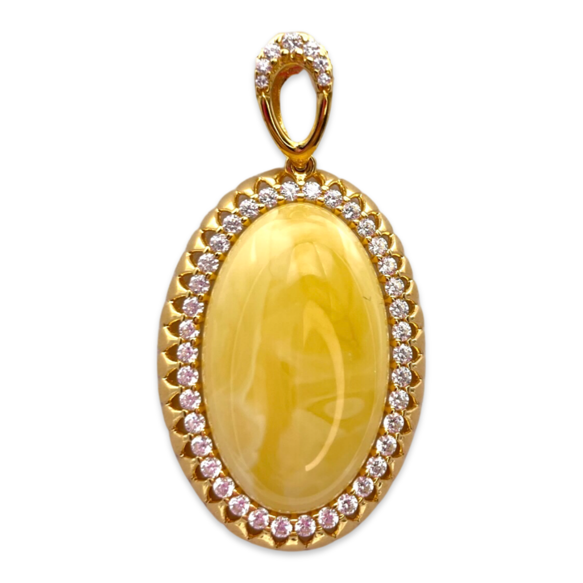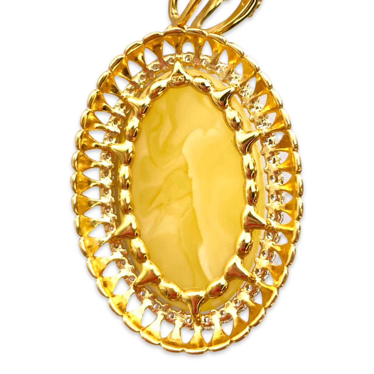 El colgante chapado en oro con ámbar y circonitas es una pieza de joyería impresionante y única que seguramente llamará la atención. El colgante presenta una piedra de ámbar de alta calidad, cuidadosamente seleccionada por su color y claridad. La piedra de ámbar está engastada en un hermoso marco chapado en oro de 24 quilates, adornado con circonitas brillantes que añaden un toque de elegancia y sofisticación al diseño. El colgante está diseñado de manera intrincada con un patrón delicado y detallado que muestra la belleza natural de la piedra de ámbar. El colgante está cuidadosamente elaborado con atención al detalle, asegurando un ajuste cómodo y seguro. Este colgante es un accesorio versátil que se puede usar tanto con atuendos casuales como formales, lo que lo convierte en una excelente adición a cualquier colección de joyas. También es un regalo considerado y especial para cumpleaños, aniversarios u otras ocasiones especiales.