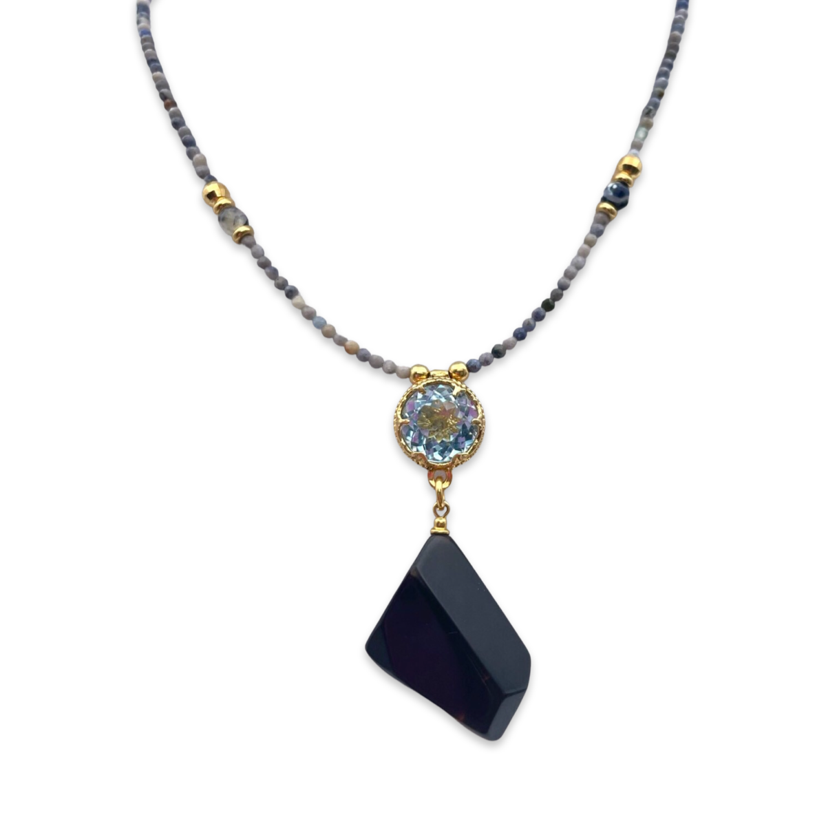 El Collar con Ámbar Negro y Topacio es perfecto para añadir un toque de dramatismo y sofisticación a cualquier atuendo. Puede usarse solo como una pieza llamativa, o combinado con otras joyas para un look más estratificado.