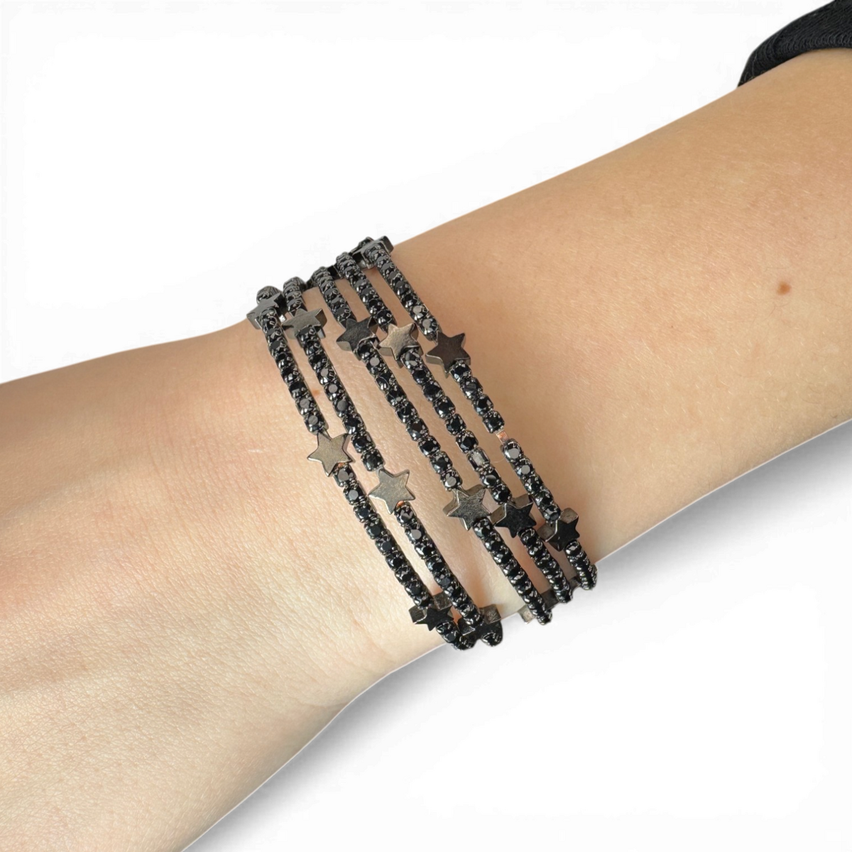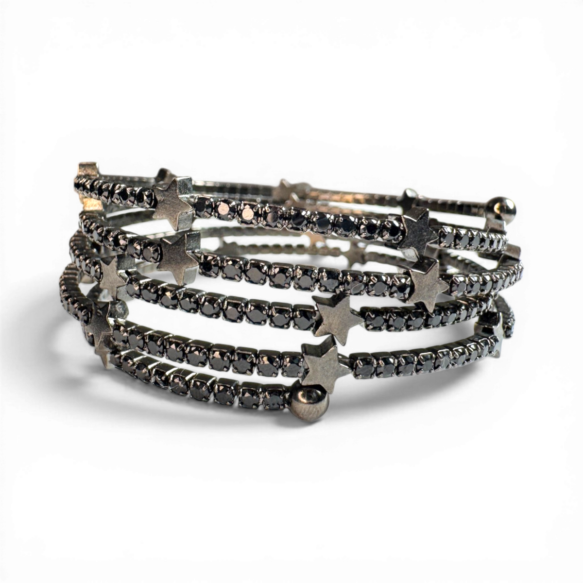 A contemporary spiral bracelet crafted from sterling silver 925, decorated with star motifs and black nano crystals. Playful yet sophisticated with a modern edge.