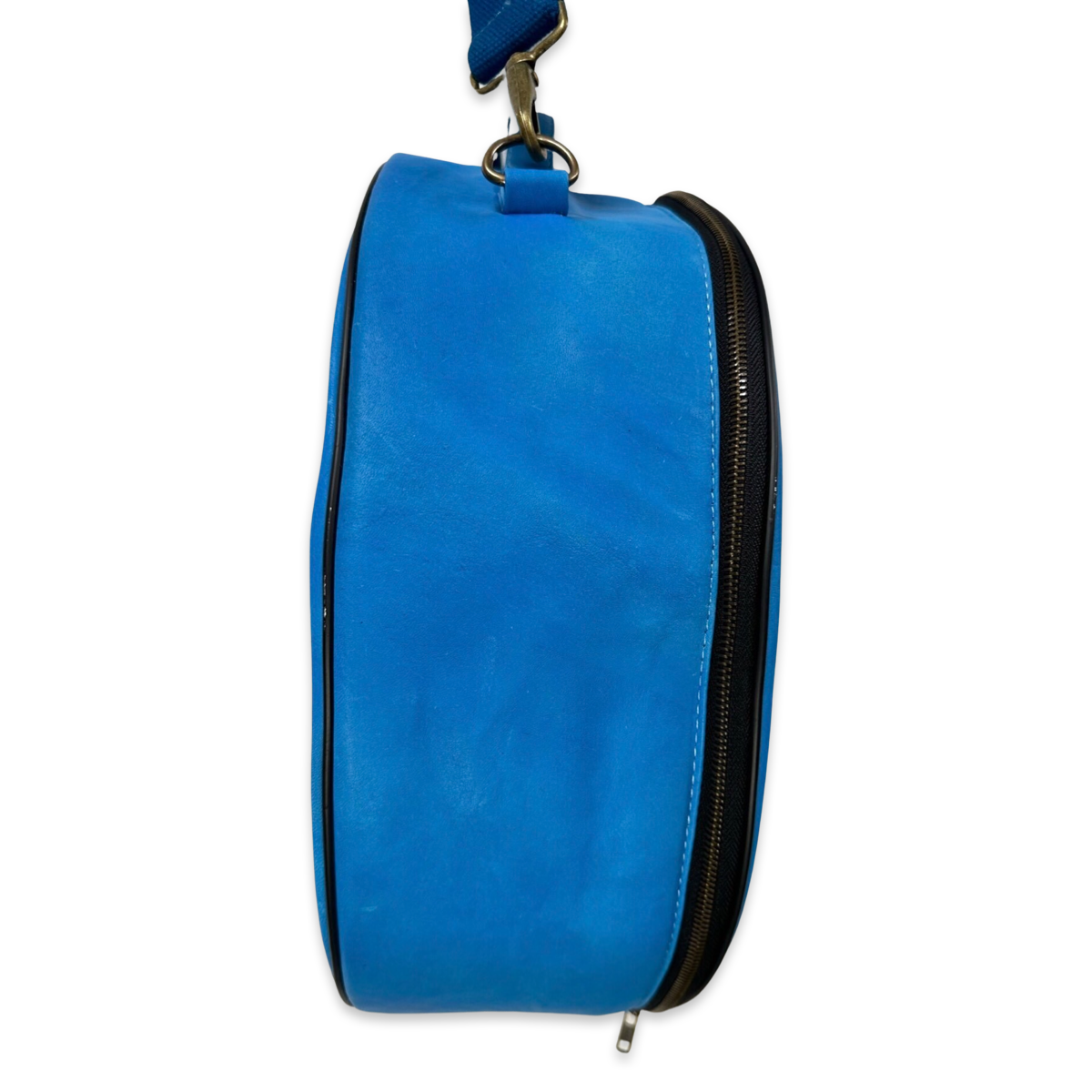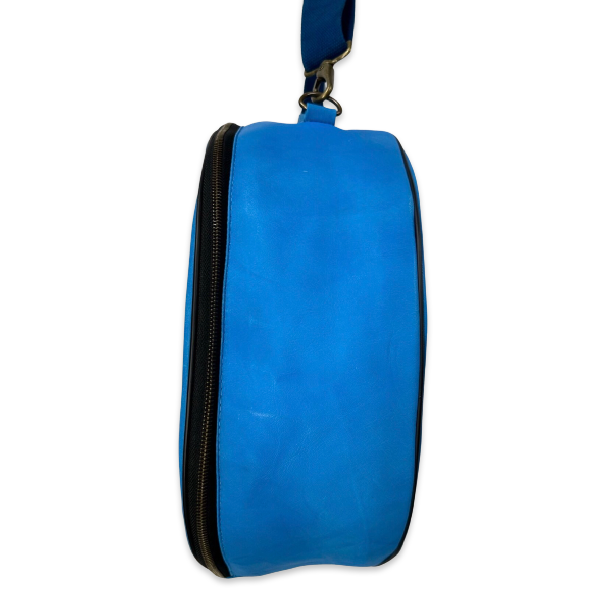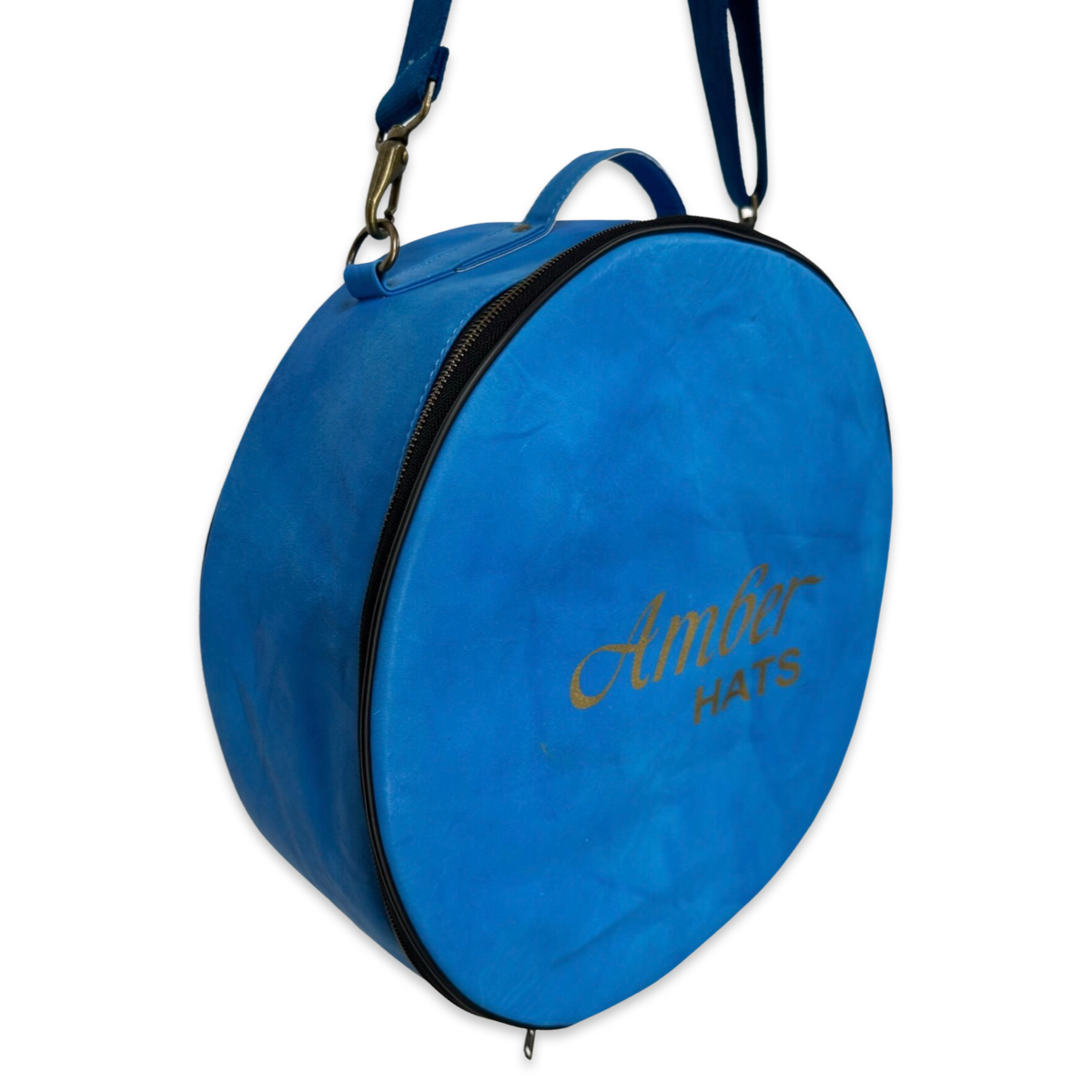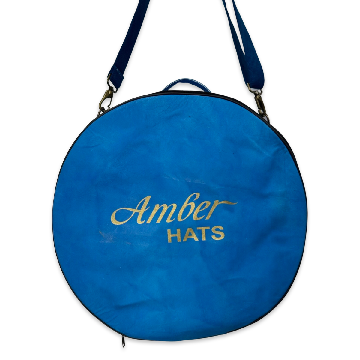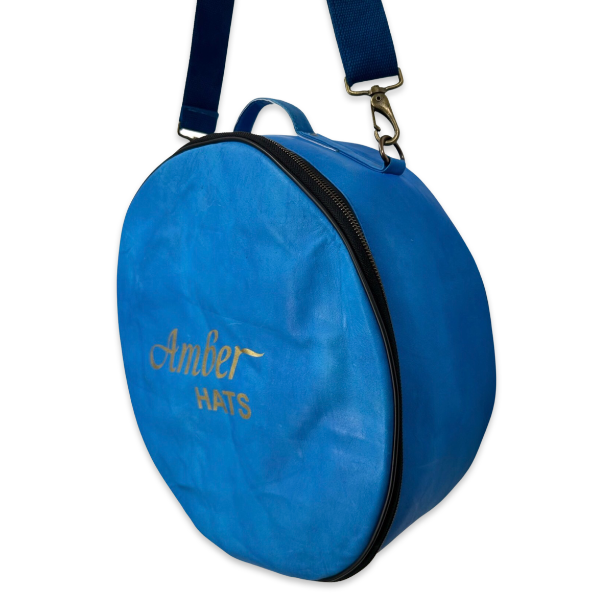 Présentation du sac à chapeaux en cuir d'agneau bleu «Amber Hats», un accessoire luxueux et élégant conçu pour protéger et transporter vos chapeaux avec la plus grande sophistication.