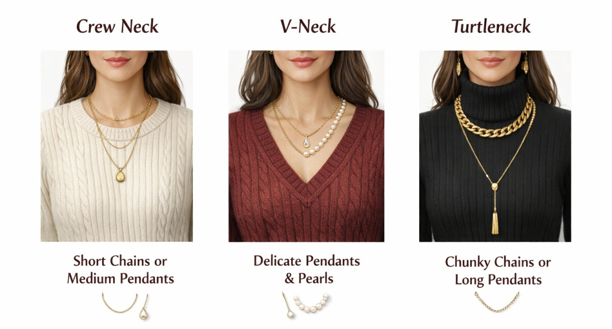 - Col rond : chaînes courtes ou pendentifs mi-longs.
