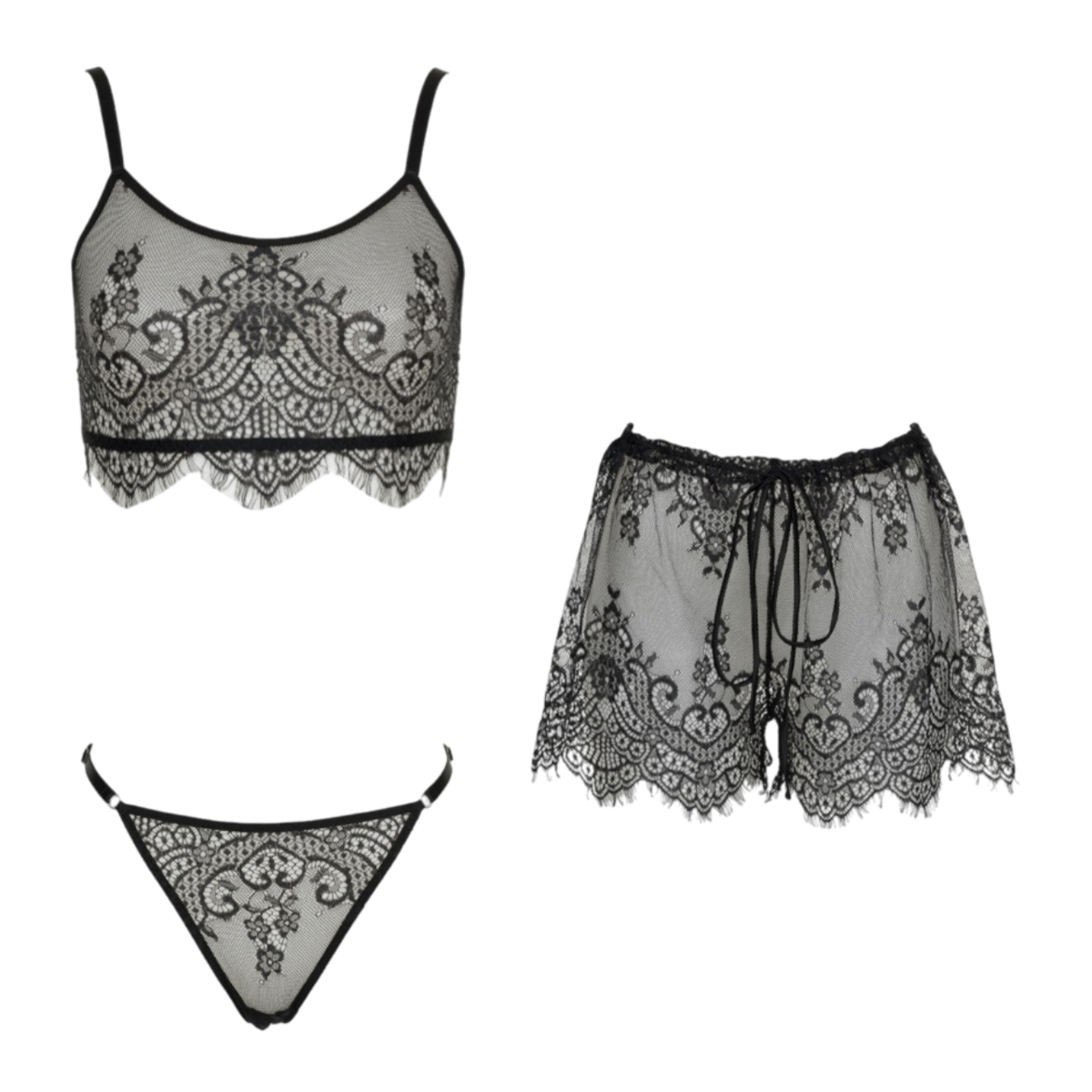 Un ensemble de lingerie en dentelle élégant et sensuel conçu pour mettre en valeur la féminité avec sophistication. L'ensemble comprend un bustier en dentelle délicate qui sublime la silhouette, un short en dentelle assorti pour le confort avec une touche de séduction, et des strings en dentelle pour une finition audacieuse et minimaliste.