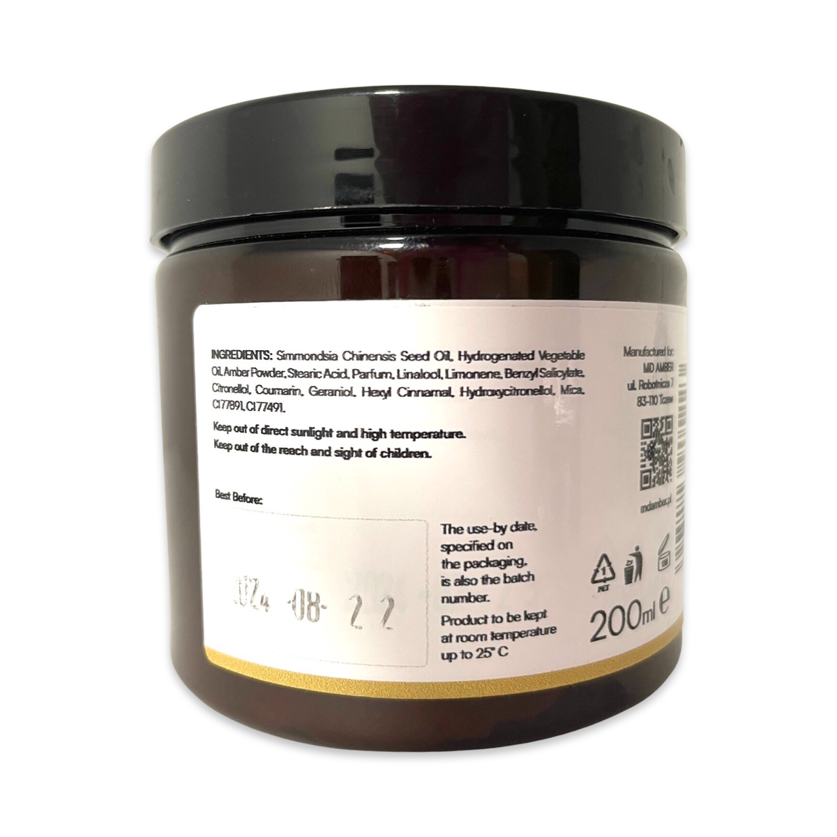 Butter Amber is a luxurious body butter that helps to nourish and protect the skin. Made with natural ingredients like simmondsia chinensis Seed Oil and amber powder, this body butter is designed to deeply moisturize and leave the skin feeling soft and smooth.The formula is easily absorbed and doesn't leave a greasy or sticky residue on the skin. This body butter is great for those with dry or sensitive skin, as it helps to provide long-lasting hydration and protection. It has a pleasant and subtle scent that is derived from natural ingredients.The packaging is also eco-friendly, as it is made with recycled materials and is recyclable. This body butter is free from parabens, sulfates, and other harmful chemicals, making it a great option for those looking for natural and safe skincare products.