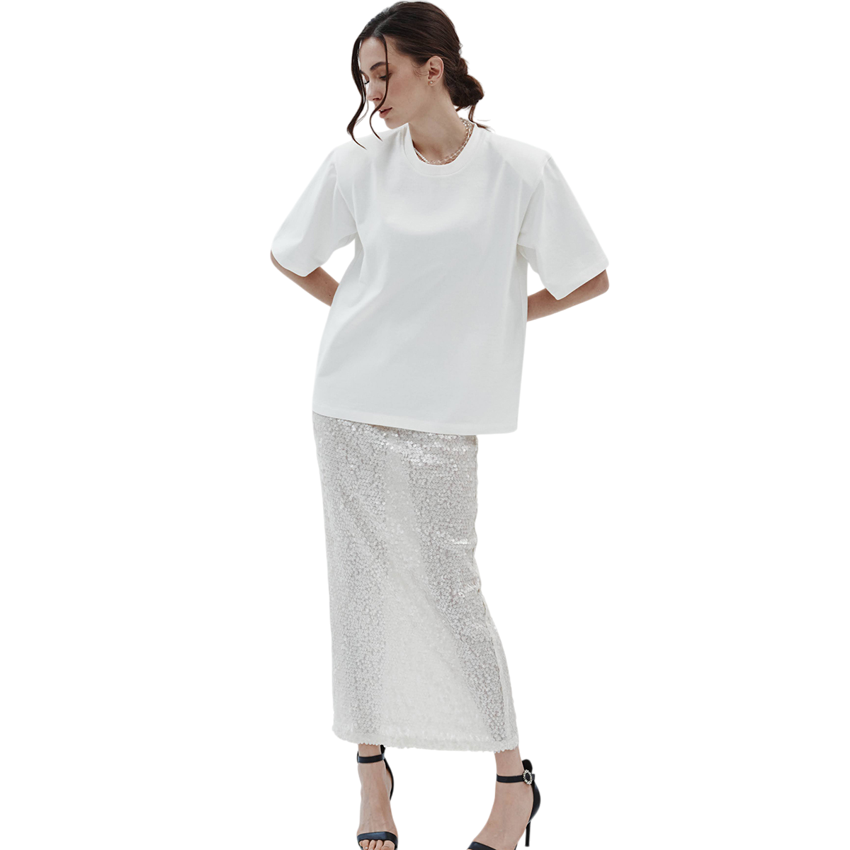 Élégante et sophistiquée, cette longue jupe blanche est ornée de délicats sequins qui captent la lumière à chaque mouvement, créant un subtil effet scintillant. La silhouette fluide ajoute grâce et fluidité, la rendant parfaite tant pour les occasions spéciales que pour des looks quotidiens raffinés. Légère et confortable, cette jupe se marie à merveille avec un chemisier simple ou un haut élégant, vous permettant de créer des ensembles à la fois classiques et contemporains. Une pièce intemporelle qui apporte une touche de glamour à votre garde-robe.
