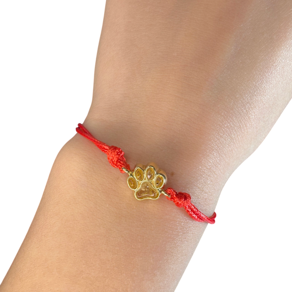 “Paw” Bracelet with Red Cord, Gold-Plated Silver Details & Natural Amber (Adjustable)