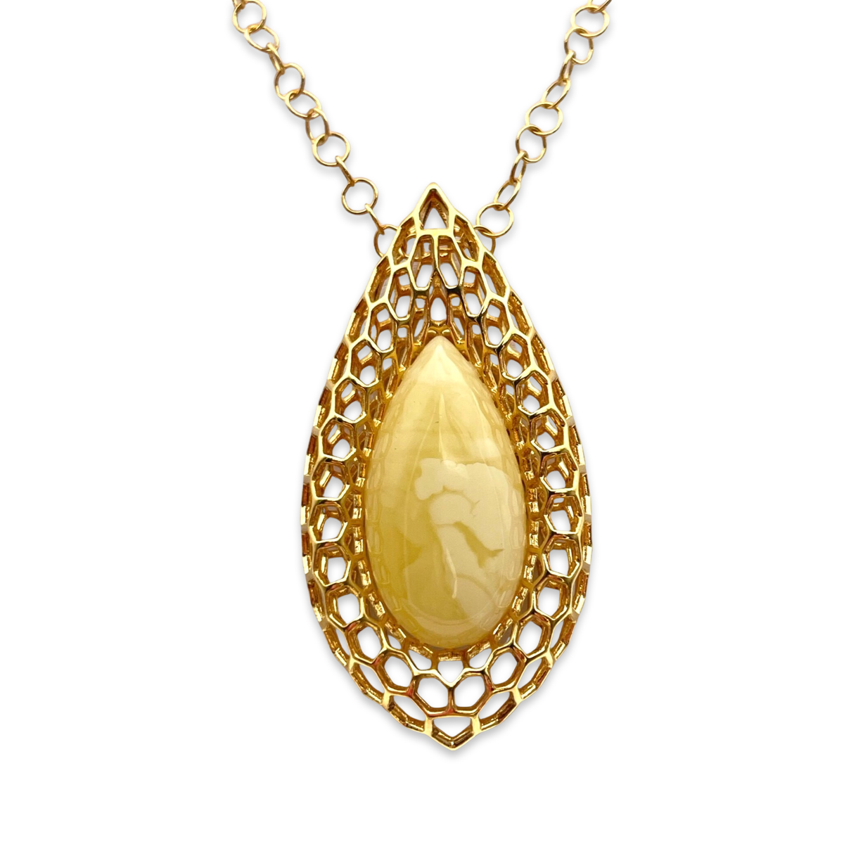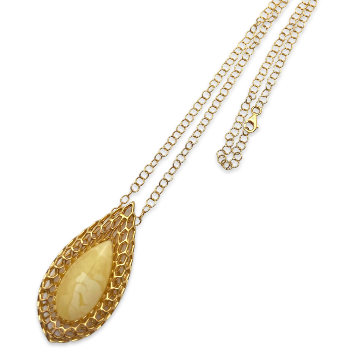 Ce magnifique collier présente une superbe pierre d'ambre sertie dans une chaîne luxueuse plaquée or 24 carats. La pierre d'ambre est soigneusement sélectionnée pour sa couleur riche et sa beauté naturelle, créant une pièce de bijouterie unique et accrocheuse. Les tons chauds de l'ambre créent un beau contraste avec le plaquage en or, faisant de ce collier un ajout élégant et sophistiqué à toute tenue.