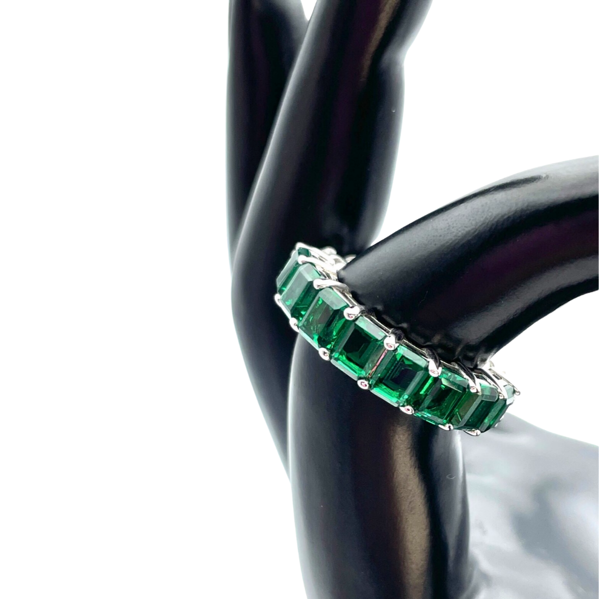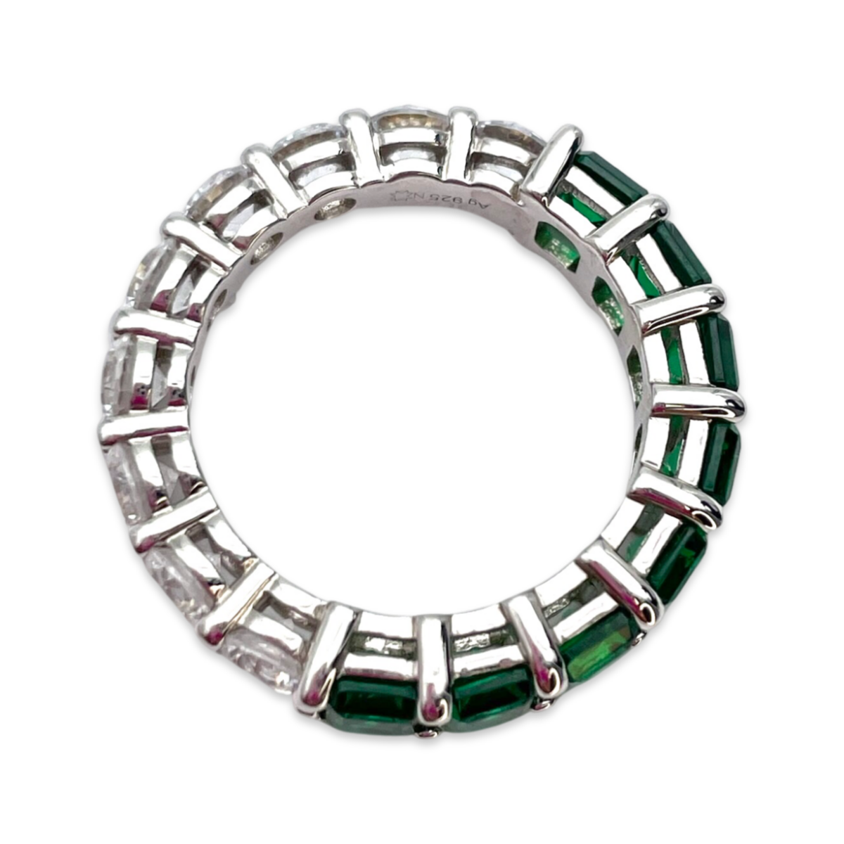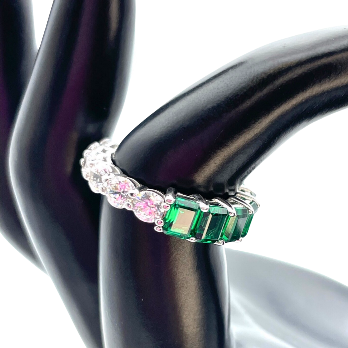 Faites une déclaration audacieuse et élégante avec notre bague en argent Half/Half Fusion Band, où l'éclat des zircons blancs et émeraude s'unissent harmonieusement pour créer un bijou inoubliable.