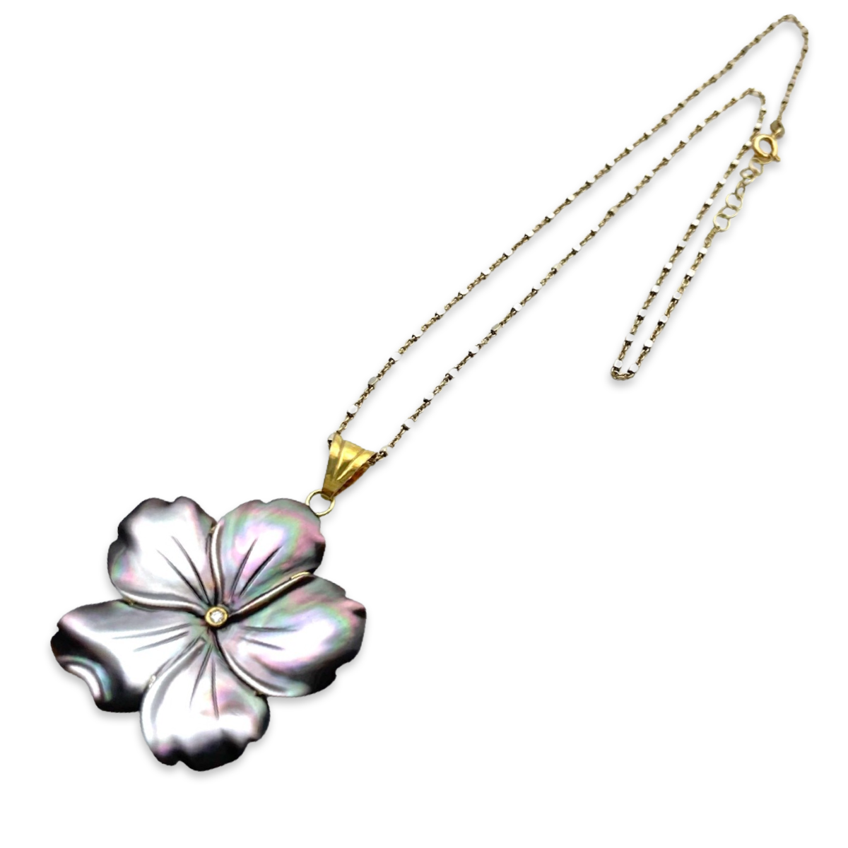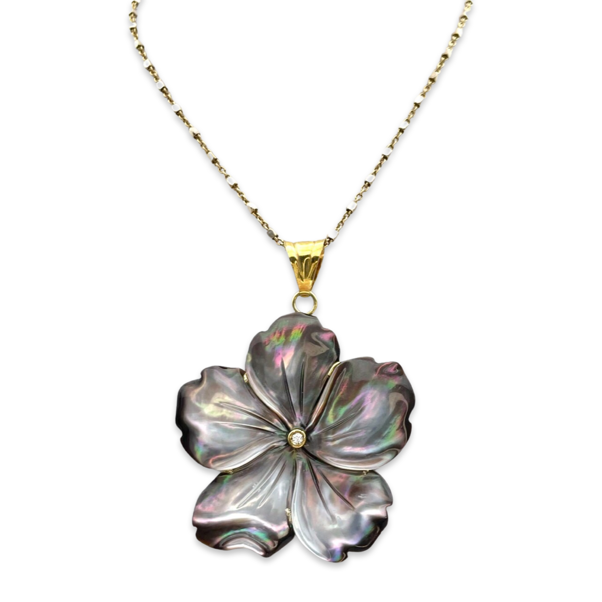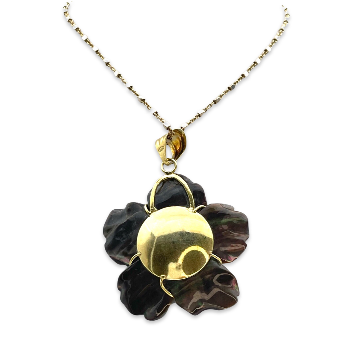 This necklace features a beautiful black mother-of-pearl flower pendant hanging from a gold-plated chain. The pendant is intricately designed to capture the beauty of a blooming flower. The necklace is perfect for any occasion, whether it's a formal event or a casual outing. It's a timeless piece that will add elegance and sophistication to any outfit. The gold-plated 24k chain is durable and adds a touch of luxury to the necklace. With its delicate design and high-quality craftsmanship, this necklace is sure to be a cherished addition to your jewelry collection.