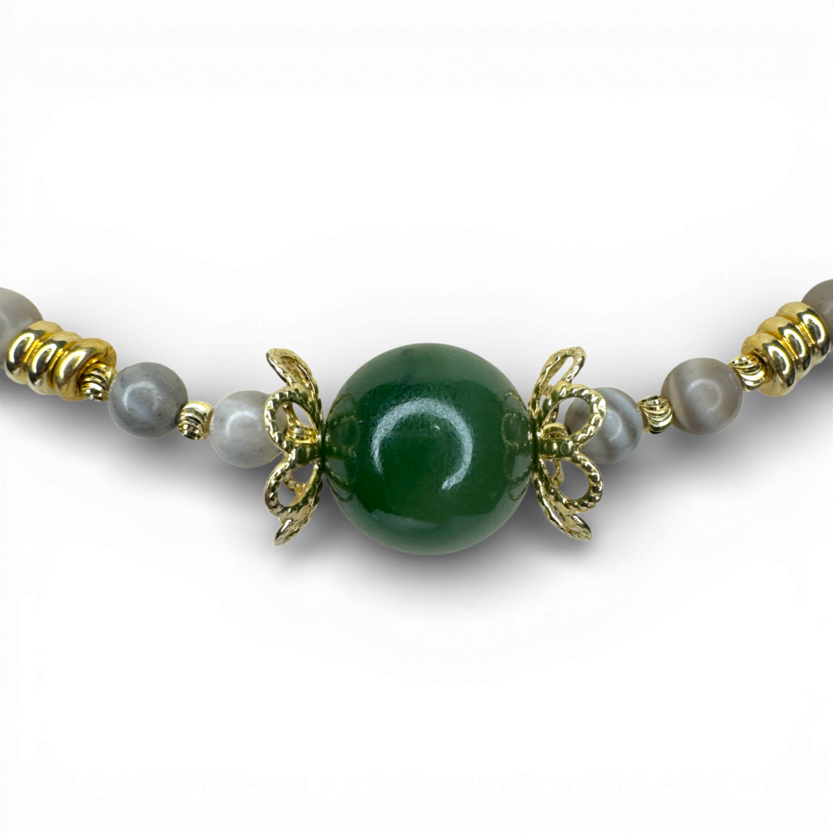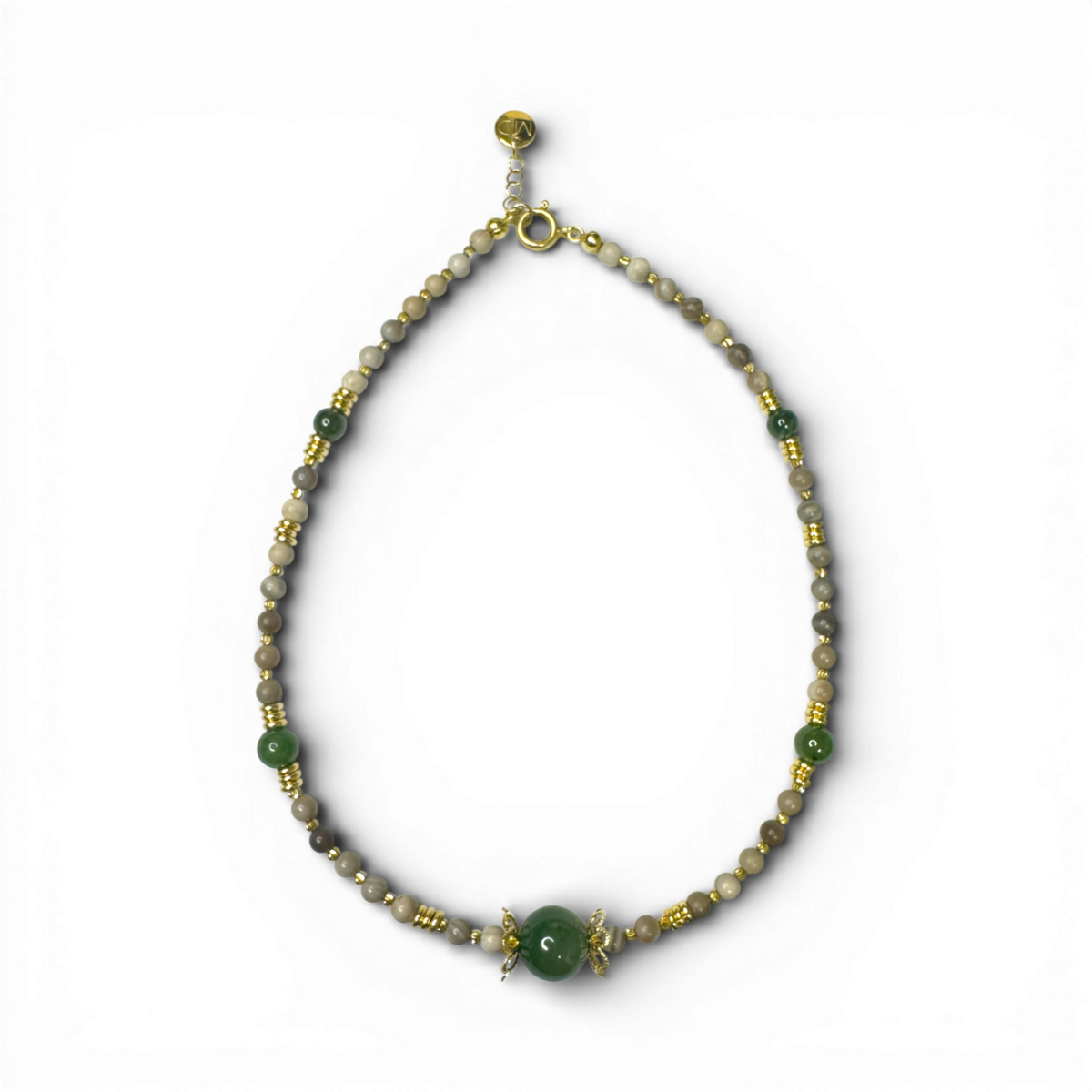 Un collier raffiné en argent plaqué or, orné de jade vert riche associé à un silex rayé distinctif. Le contraste entre la couleur lisse et la texture naturelle crée une déclaration moderne mais intemporelle. Élégant, équilibré et d'une sophistication sans effort — une pièce polyvalente conçue pour rehausser à la fois les looks quotidiens et de soirée.