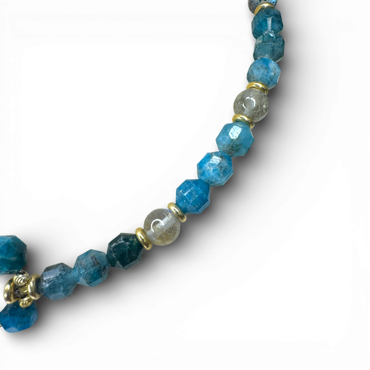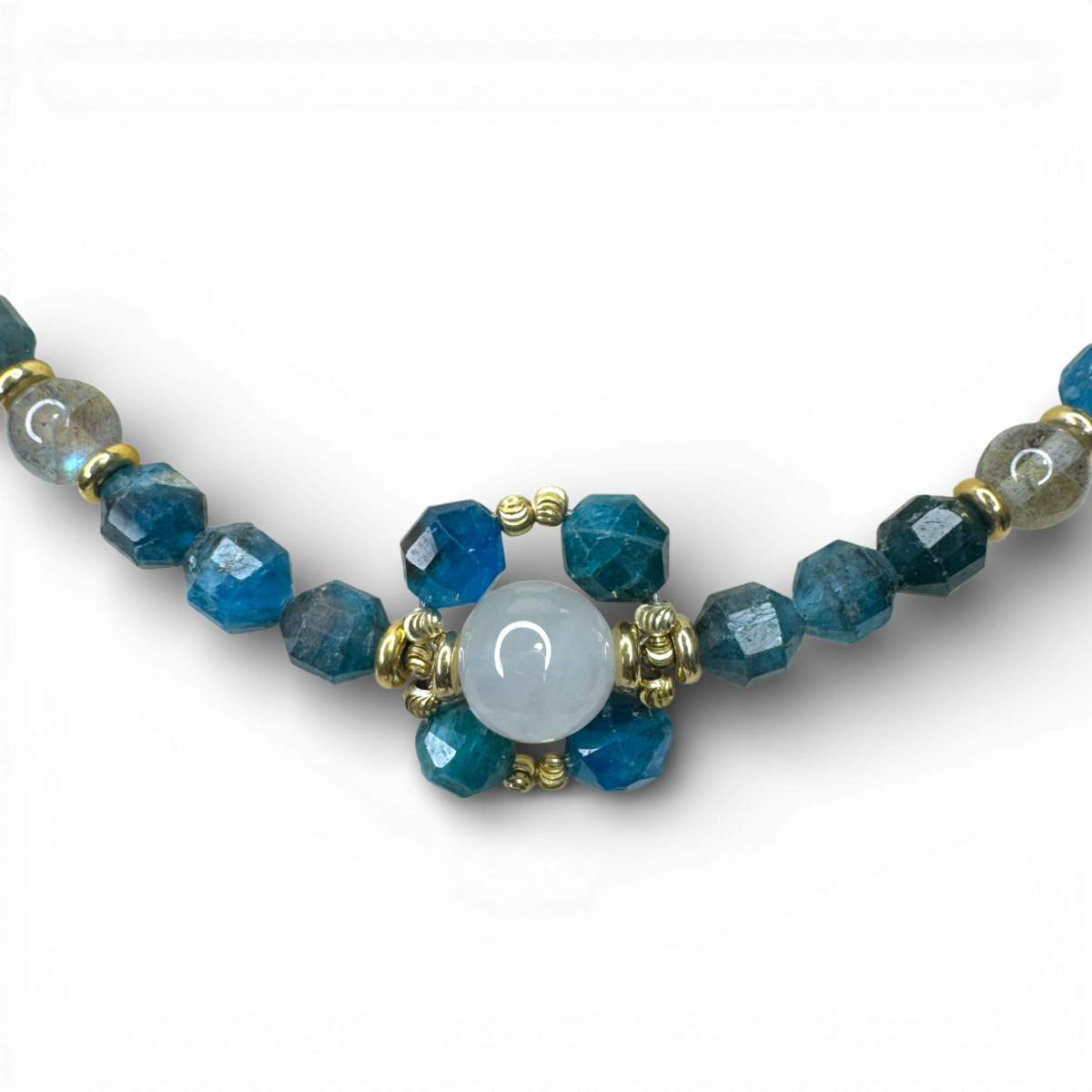 Un collier délicat en argent plaqué or, orné de quartz rose doux, de labradorite lumineuse et d'apatite aux tons frais. Le mélange harmonieux de pastels doux et de profondeur subtile crée une déclaration élégante et moderne. Raffiné, féminin et d'une élégance sans effort — conçu pour sublimer les tenues quotidiennes et de soirée.