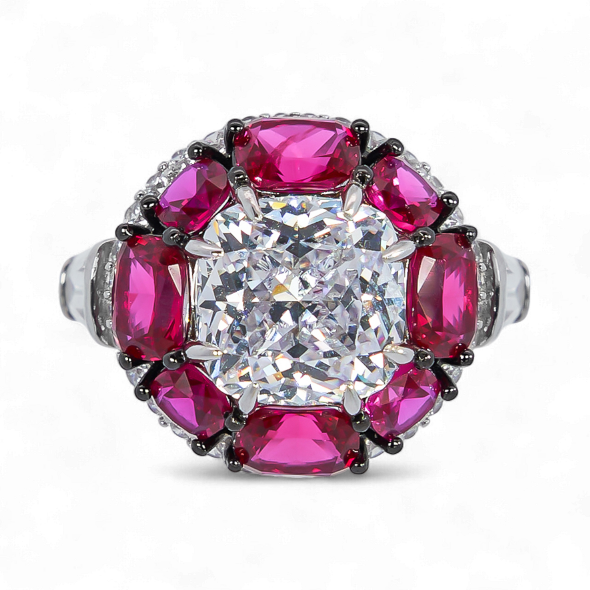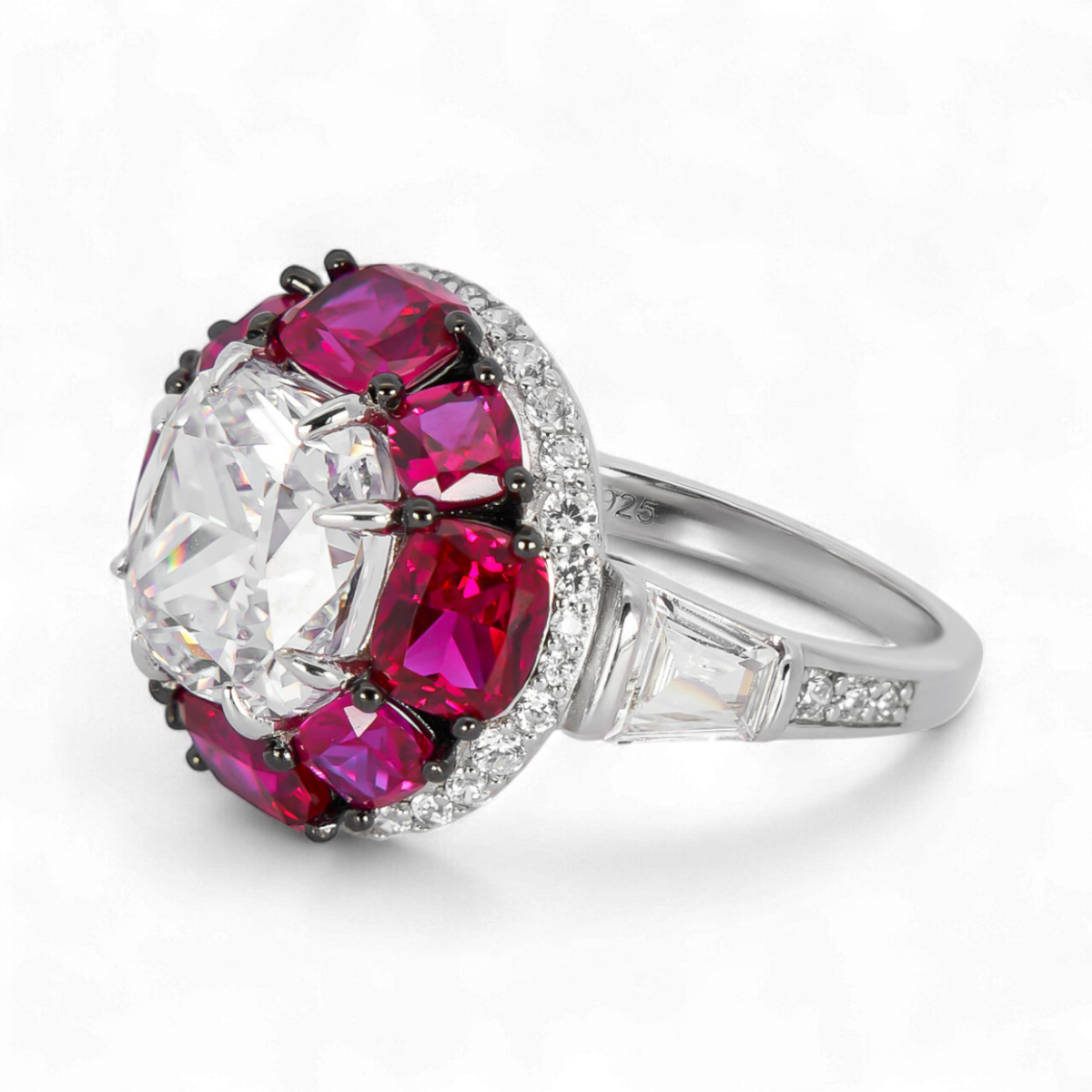 Cette magnifique bague ronde en pierre précieuse est fabriquée en argent sterling 925 de haute qualité et présente un zircon blanc brillant au centre, entouré de zircons rouges vibrants pour un look audacieux et élégant.