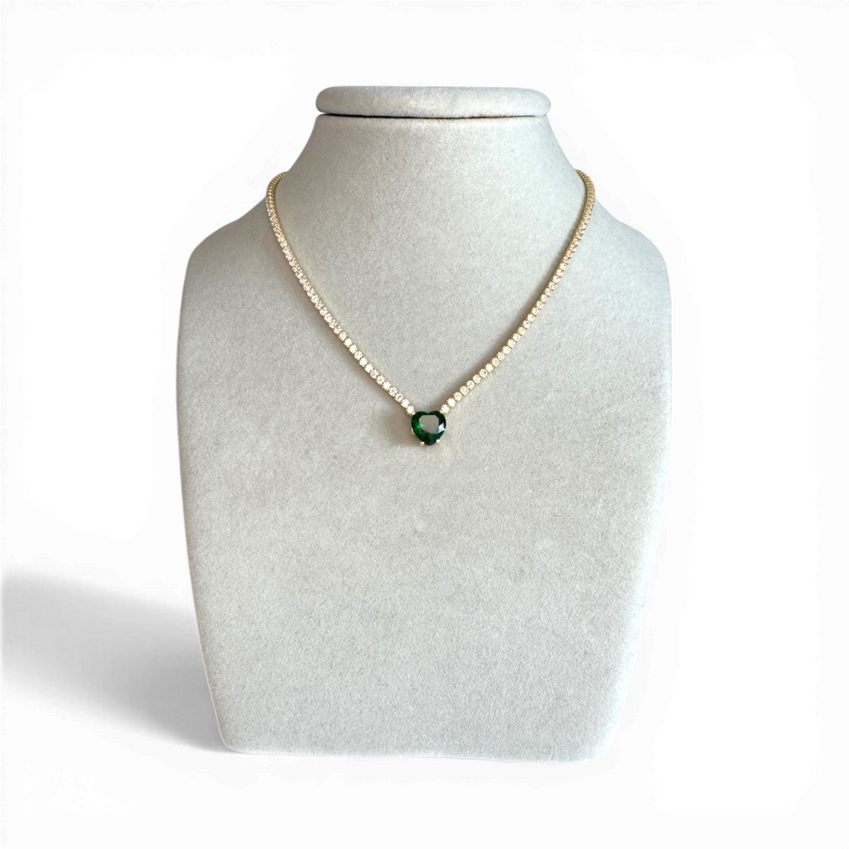 A refined tennis necklace crafted from sterling silver 925, featuring white zirconia and a green heart pendant. Elegant with a fresh accent.