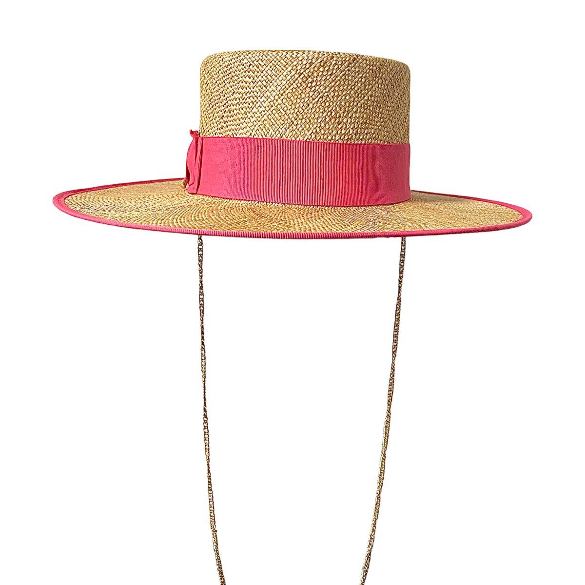 Make a bold fashion statement with our Baciami Stupido Straw Hat, a stunning accessory that exudes glamour and sophistication. Crafted with meticulous attention to detail, this hat boasts a maxi boat silhouette with a wide and rigid brim measuring 13 cm, ensuring you stand out in any crowd.The hat is adorned with a grosgrain gasket in pink, featuring taut edging meticulously done by hand. This delicate detail adds a touch of elegance and refinement to the hat, elevating its overall aesthetic.To complete the look, a golden chain adorns the hat, adding a hint of luxury and glamour. Whether you're lounging by the pool or attending a chic garden party, the Baciami Stupido Straw Hat is sure to turn heads and make you feel like a style icon.Pair it with a flowing maxi dress for a glamorous summer ensemble, or style it with tailored separates for a sophisticated look. With its bold design and luxurious details, this hat is the perfect accessory to elevate your summer wardrobe to new heights of elegance.Indulge in luxury with our Baciami Stupido Straw Hat and make a bold fashion statement wherever you go.