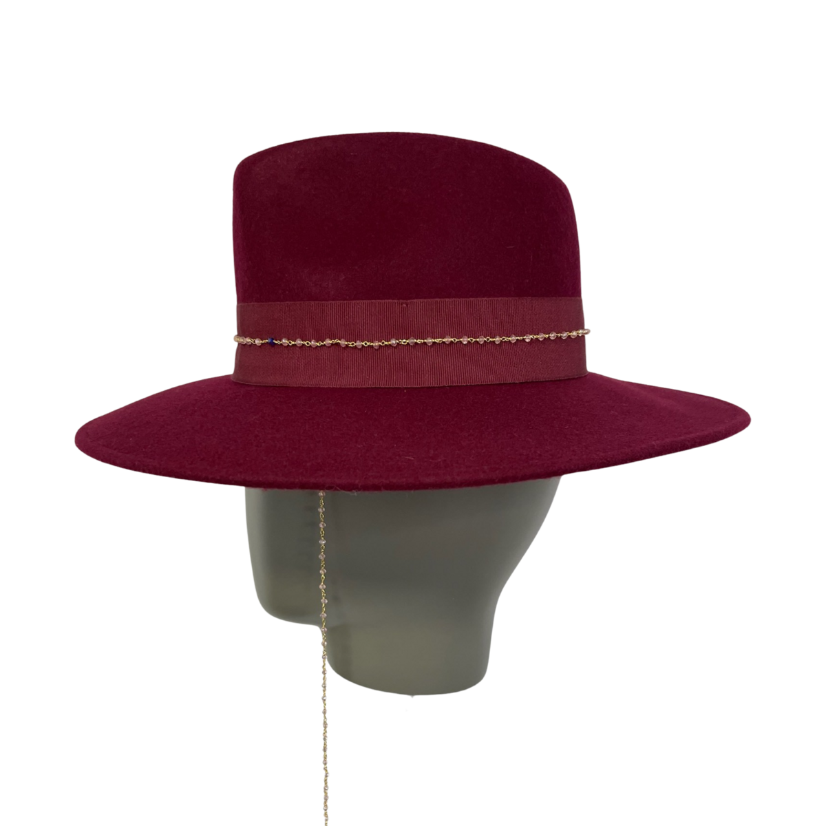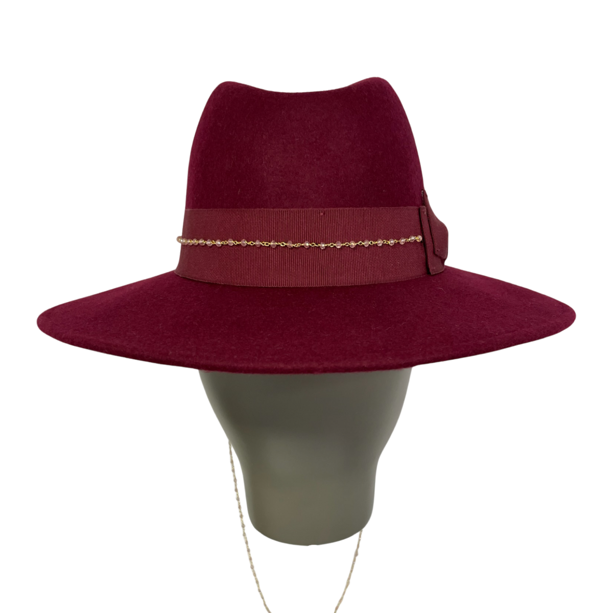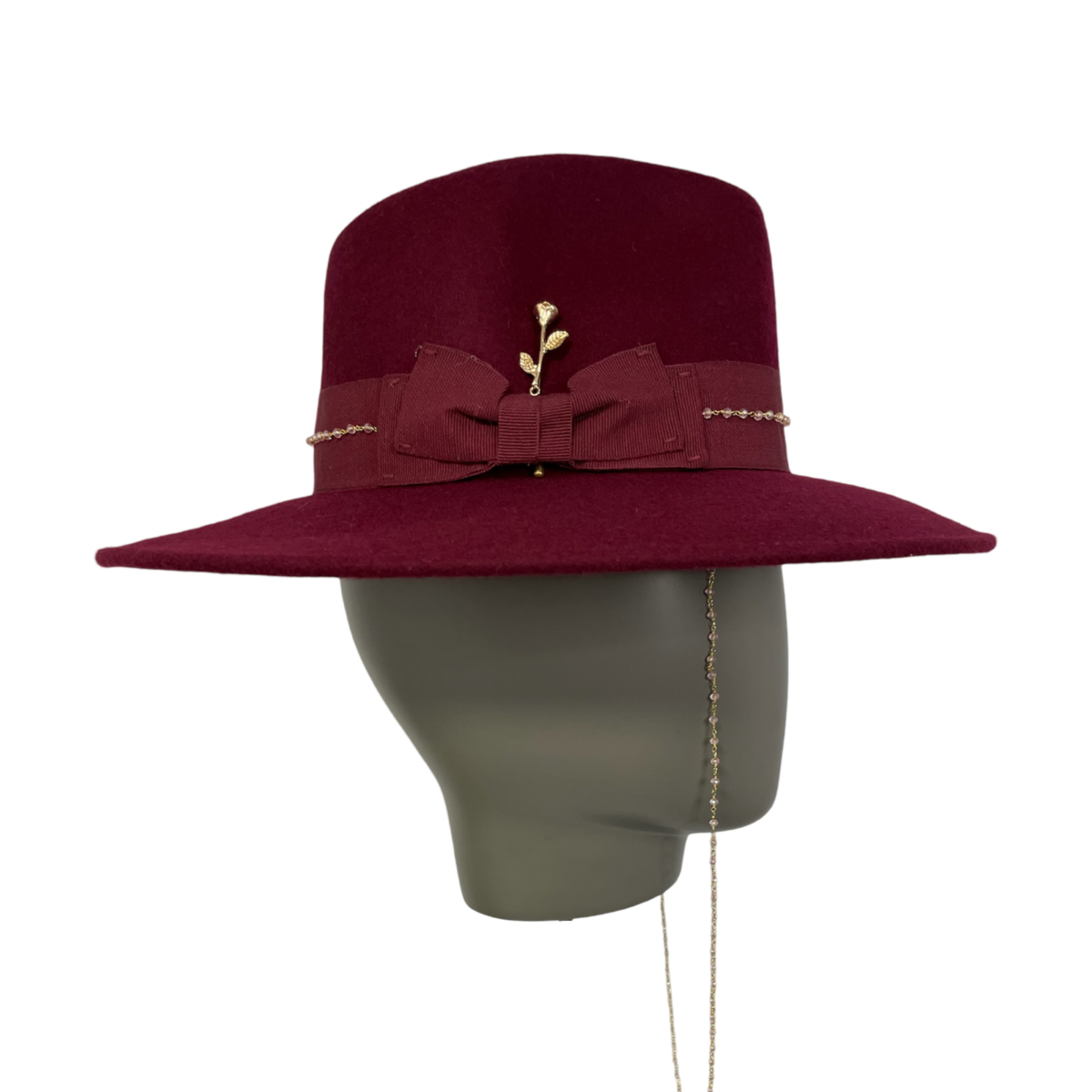The Elisabeth hat is a luxurious maxi brim fedora crafted from 100% wool. Featuring a rich burgundy color, it is accented with a black cotton ribbon, a golden piercing, and a floral brooch. The removable pearl chain adds versatility and elegance. The stitched, soft brim measures 10 cm, providing a sophisticated and bold statement. Perfect for elevating your style.