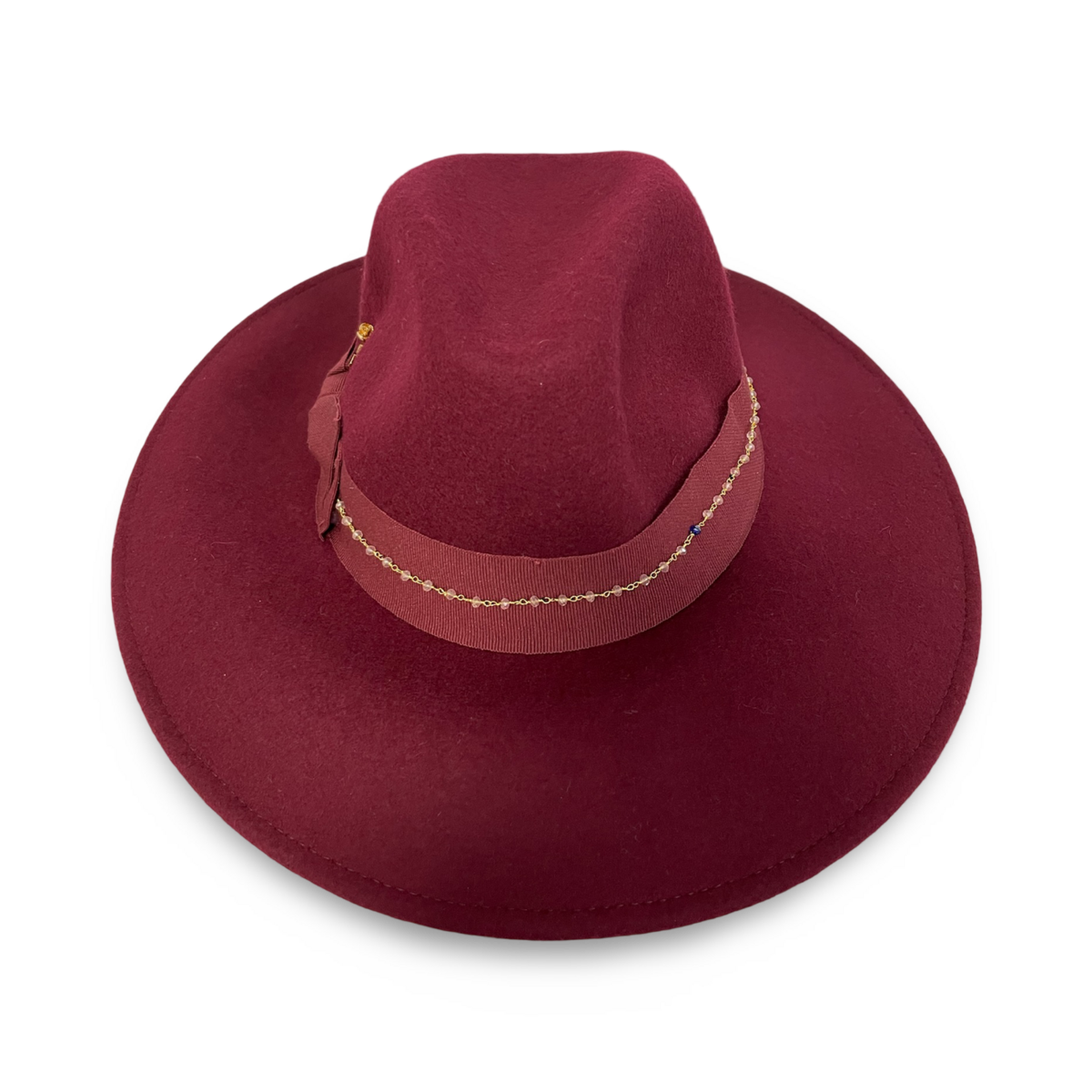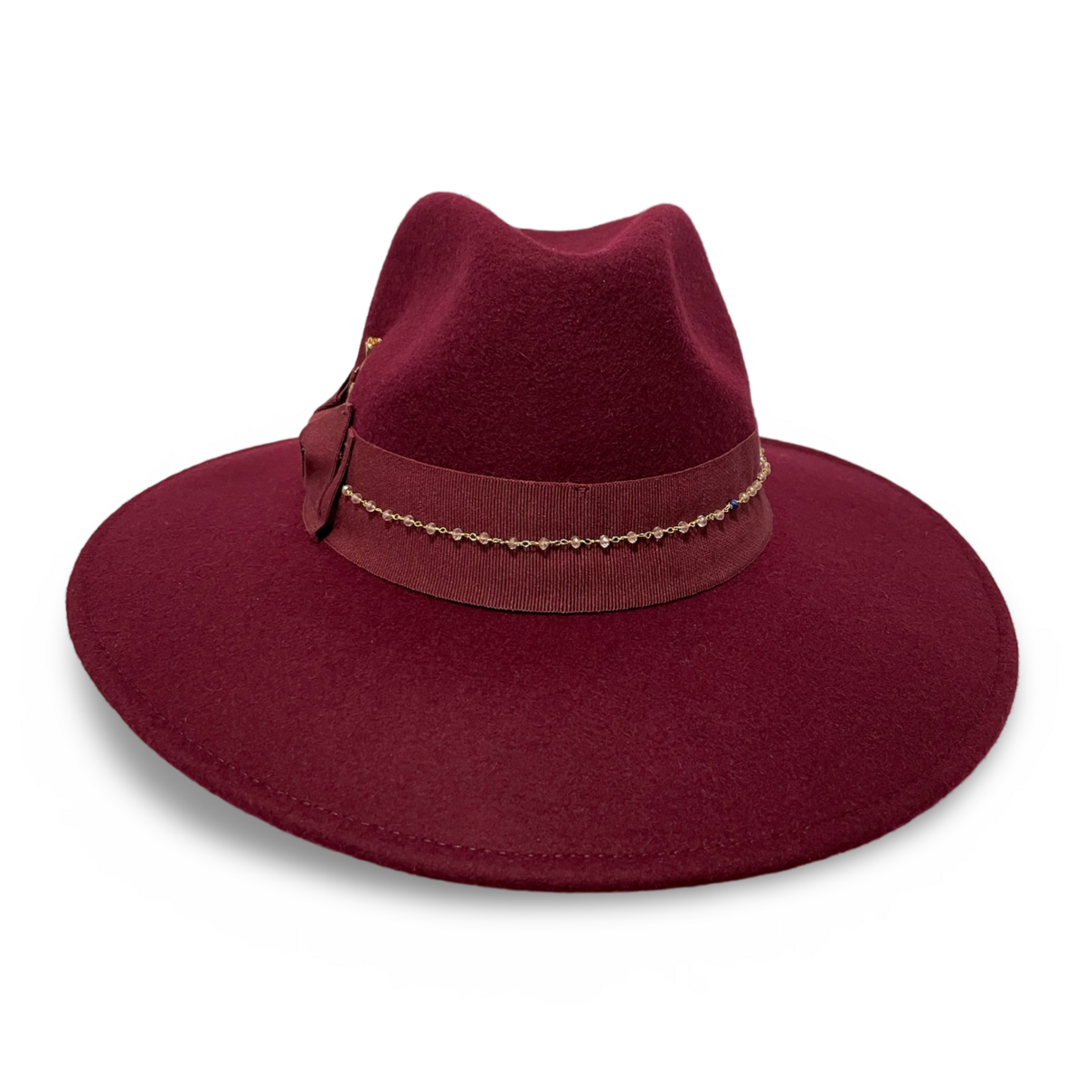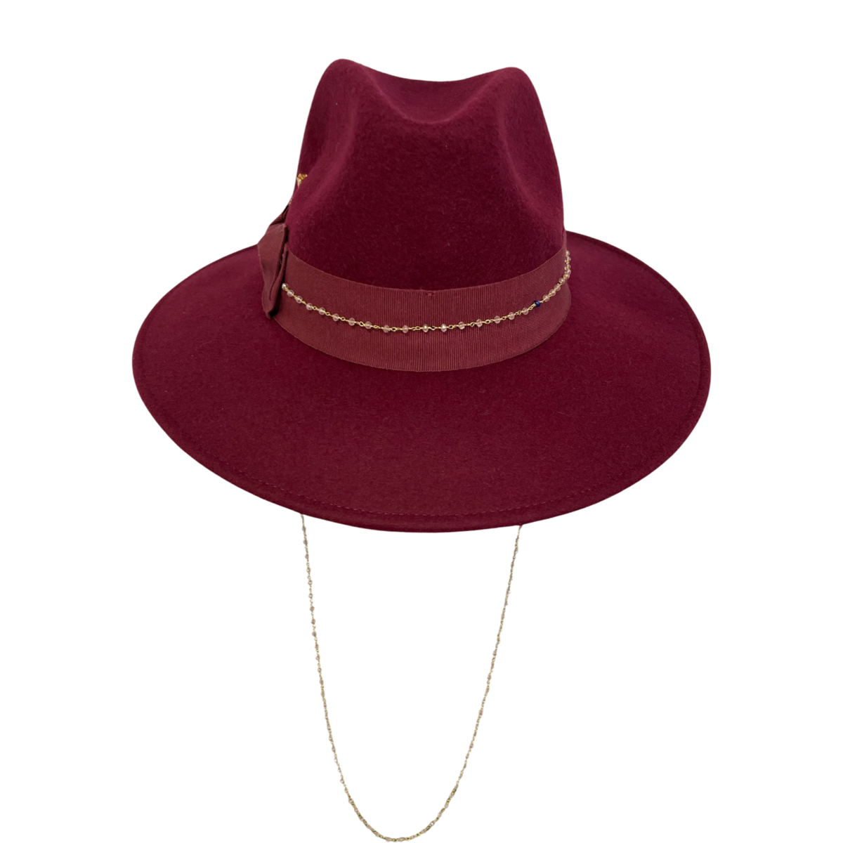 The Elisabeth hat is a luxurious maxi brim fedora crafted from 100% wool. Featuring a rich burgundy color, it is accented with a black cotton ribbon, a golden piercing, and a floral brooch. The removable pearl chain adds versatility and elegance. The stitched, soft brim measures 10 cm, providing a sophisticated and bold statement. Perfect for elevating your style.