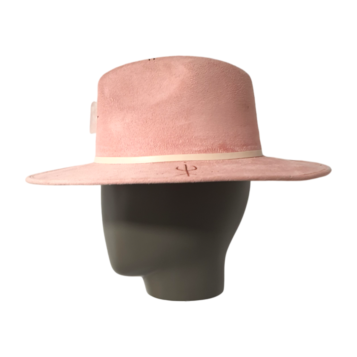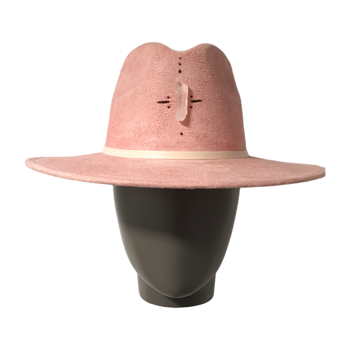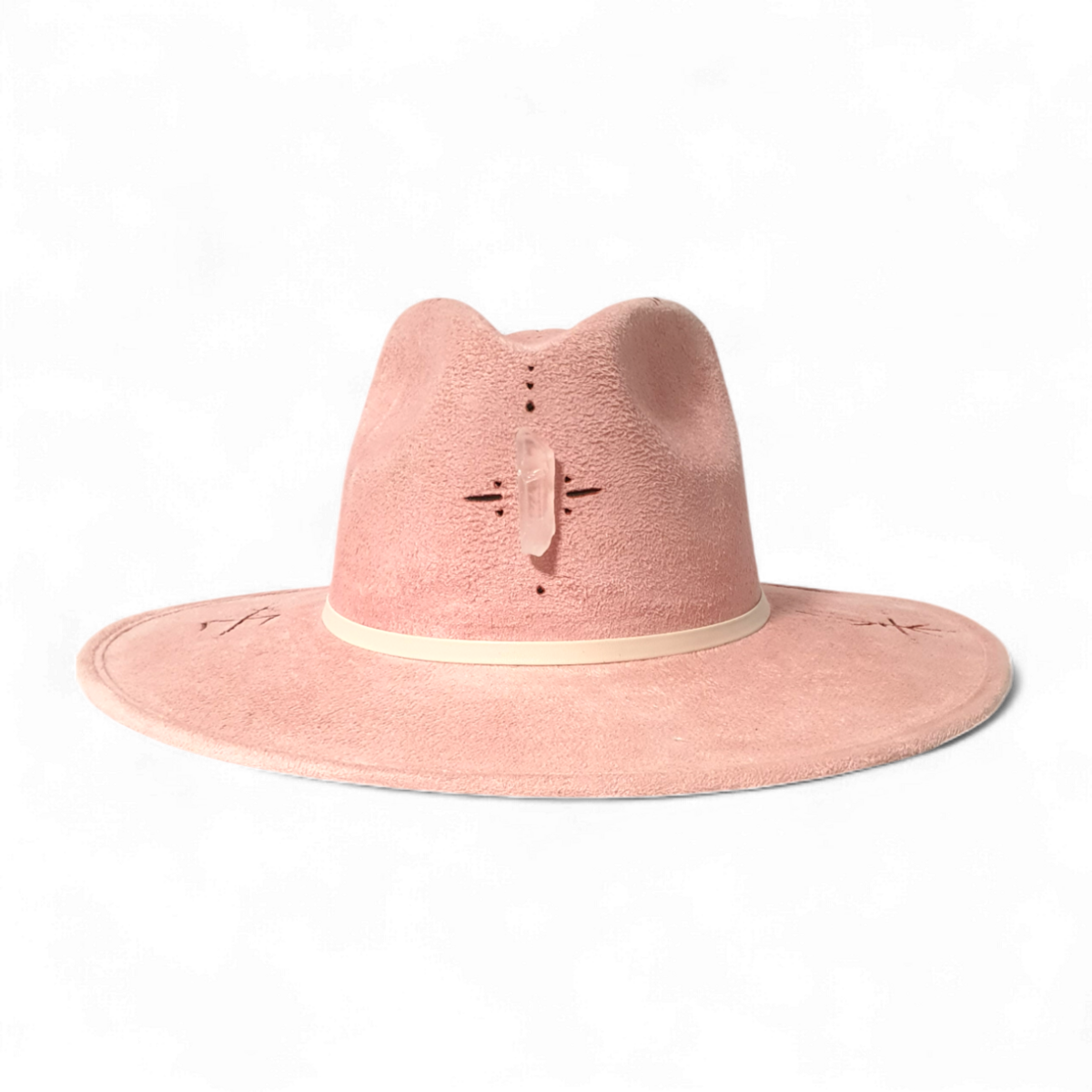 A contemporary take on the classic fedora hat, crafted from soft textile suede in a light pink hue. This unique piece is adorned with natural quartz stone and features intricate hand-painted pyrography, making each hat a one-of-a-kind statement accessory. The combination of artisanal craftsmanship and bold design creates a modern, artistic silhouette — perfect for those who appreciate distinctive and expressive style.