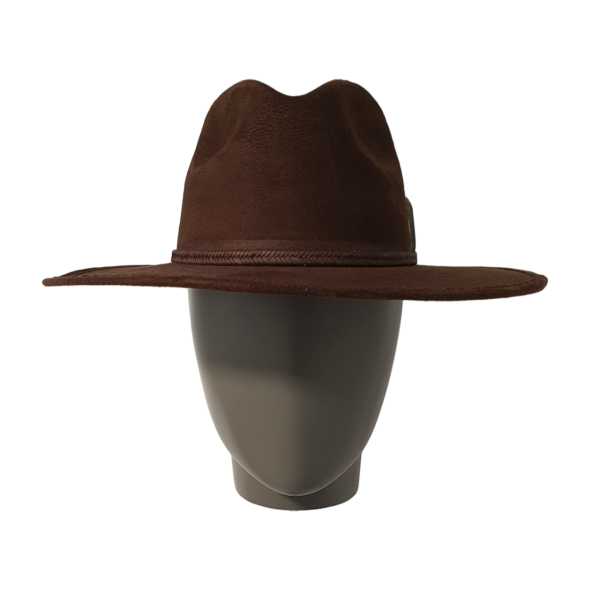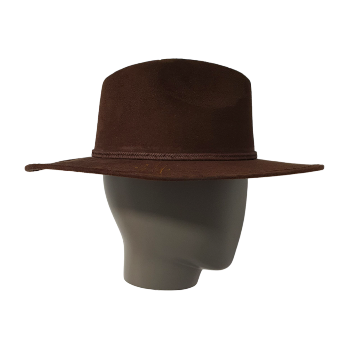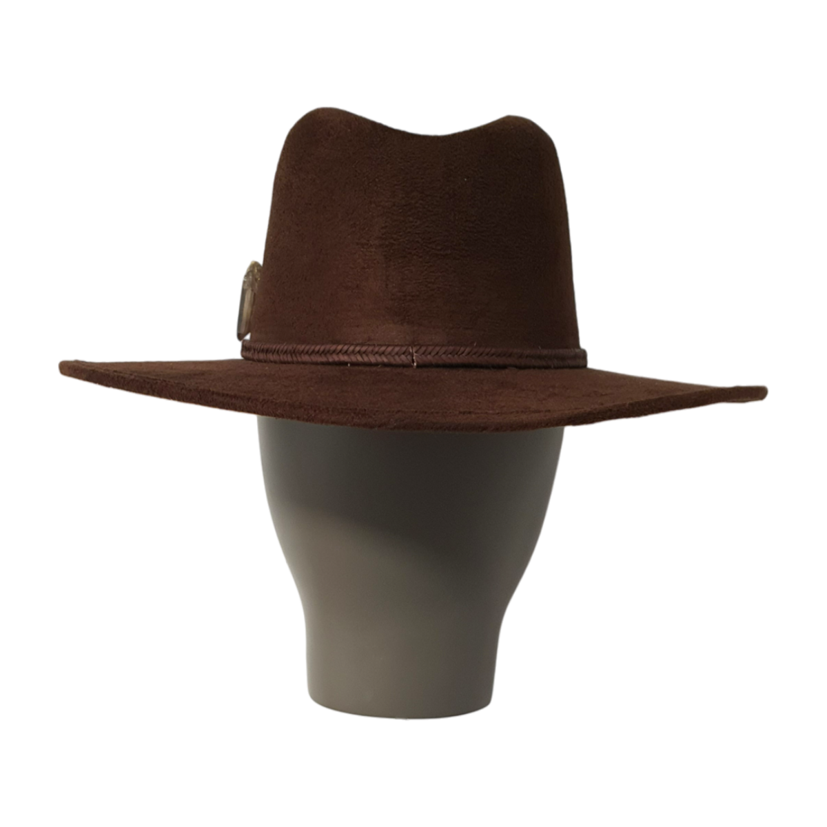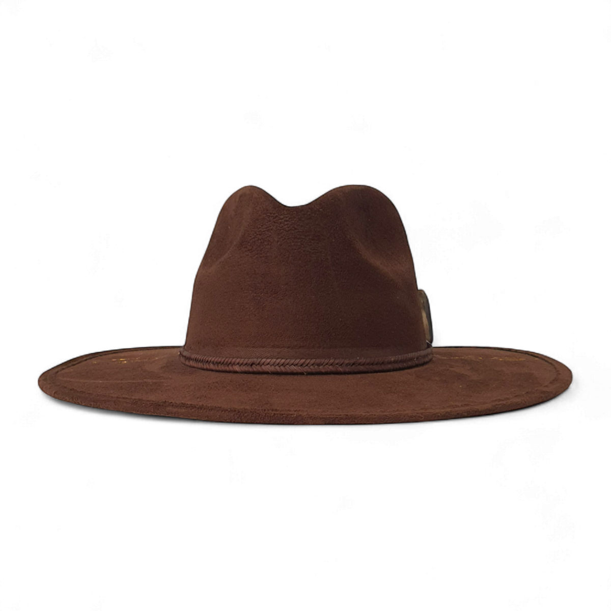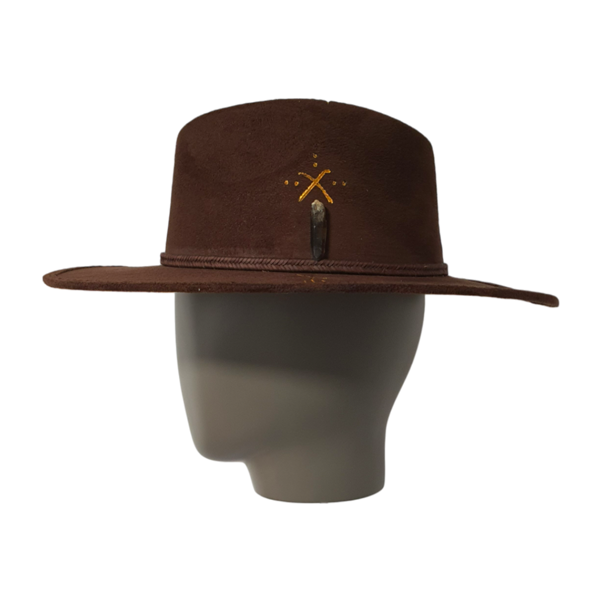 A contemporary take on the classic fedora hat, crafted from soft textile suede in a tobacco hue. This unique piece is adorned with natural quartz stone and features intricate hand-painted pyrography, making each hat a one-of-a-kind statement accessory. The combination of artisanal craftsmanship and bold design creates a modern, artistic silhouette — perfect for those who appreciate distinctive and expressive style.