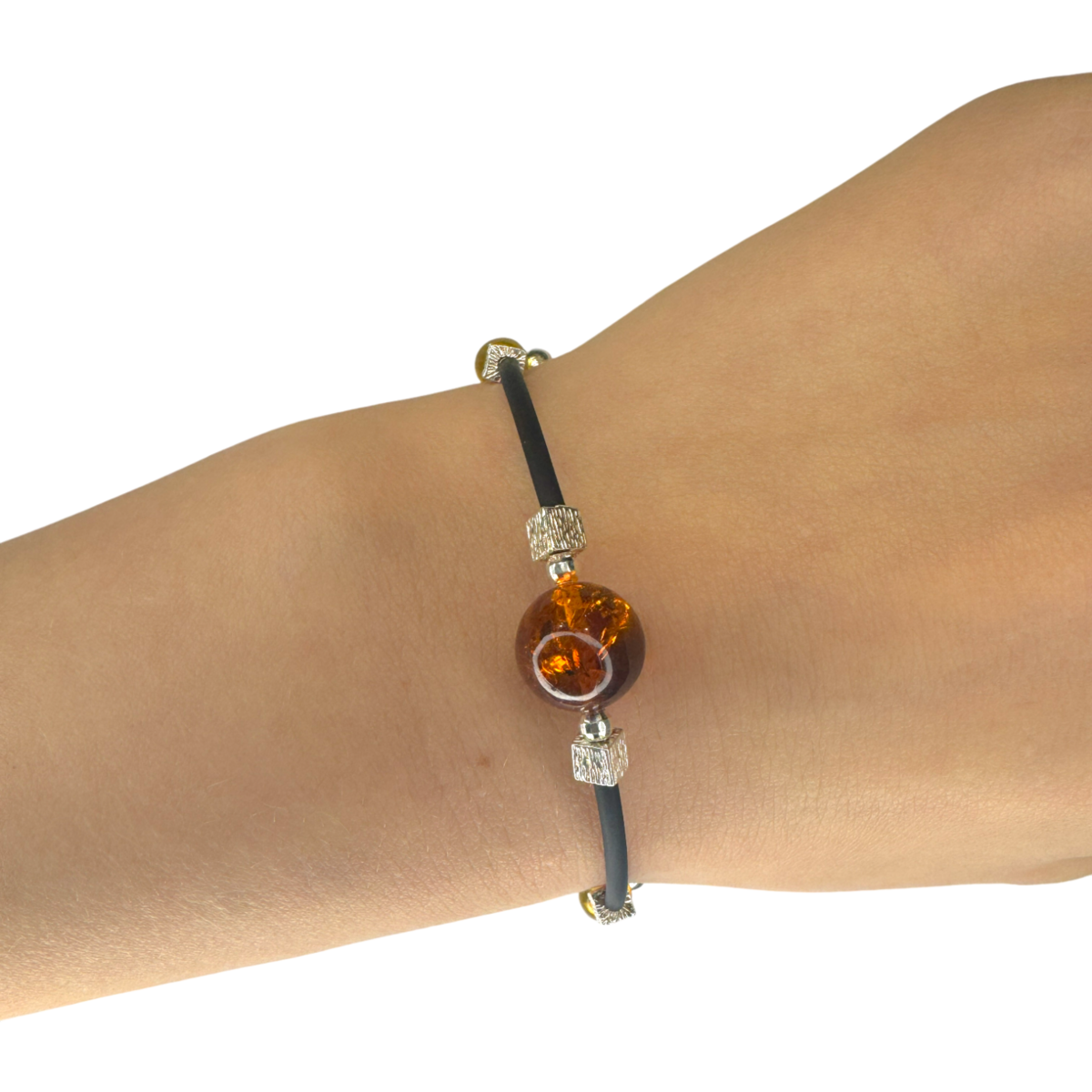 A contemporary amber bracelet crafted with a flexible rubber cord and refined silver details. The warm glow of natural amber contrasts with the clean, modern design, creating an understated yet expressive accent. Adjustable for a perfect fit, comfortable, and effortlessly stylish — ideal for everyday wear.