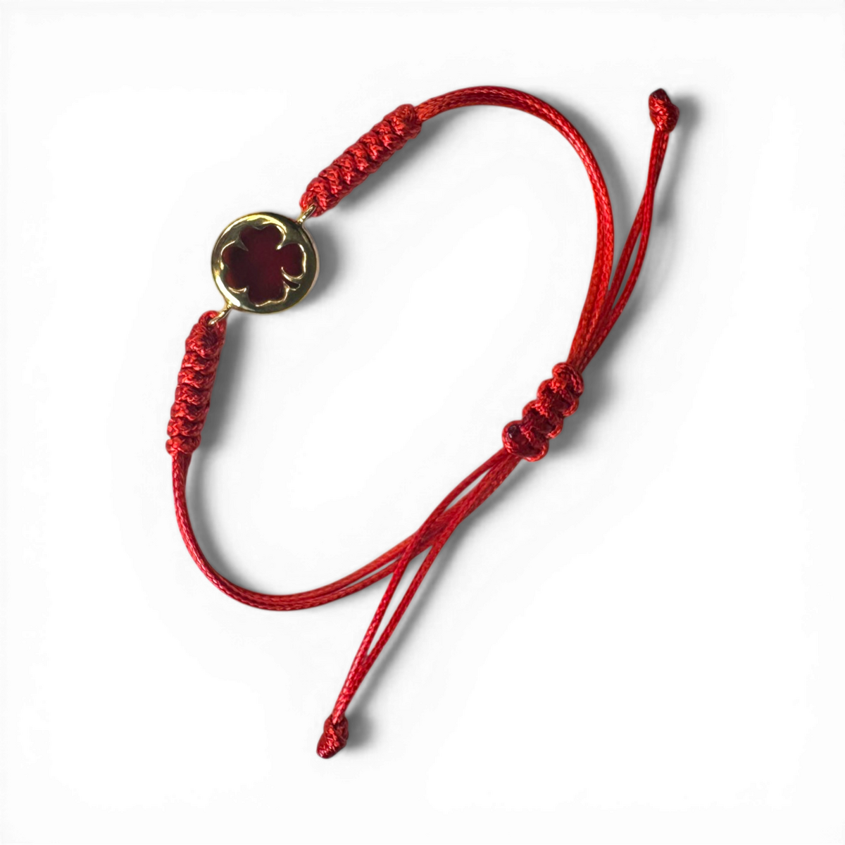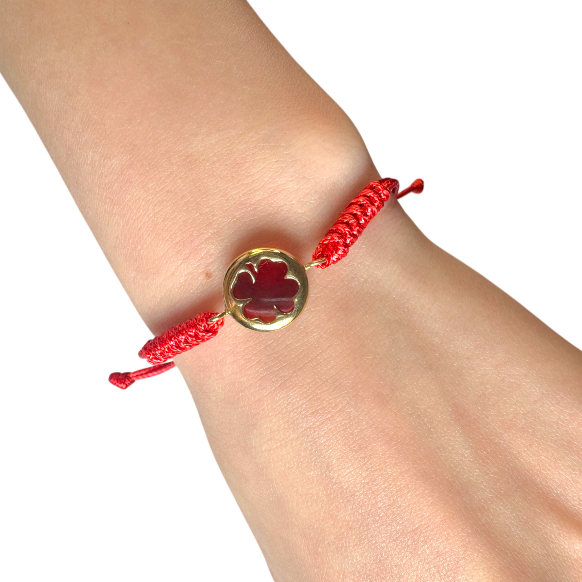 “Four-Leaf Clover” Bracelet with Red Cord, Gold-Plated Silver Details & Natural Amber (Adjustable)
