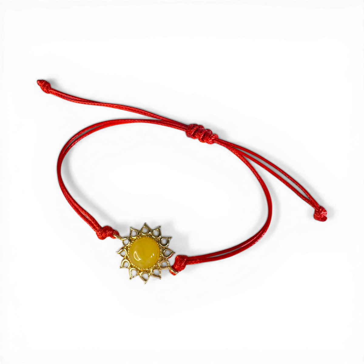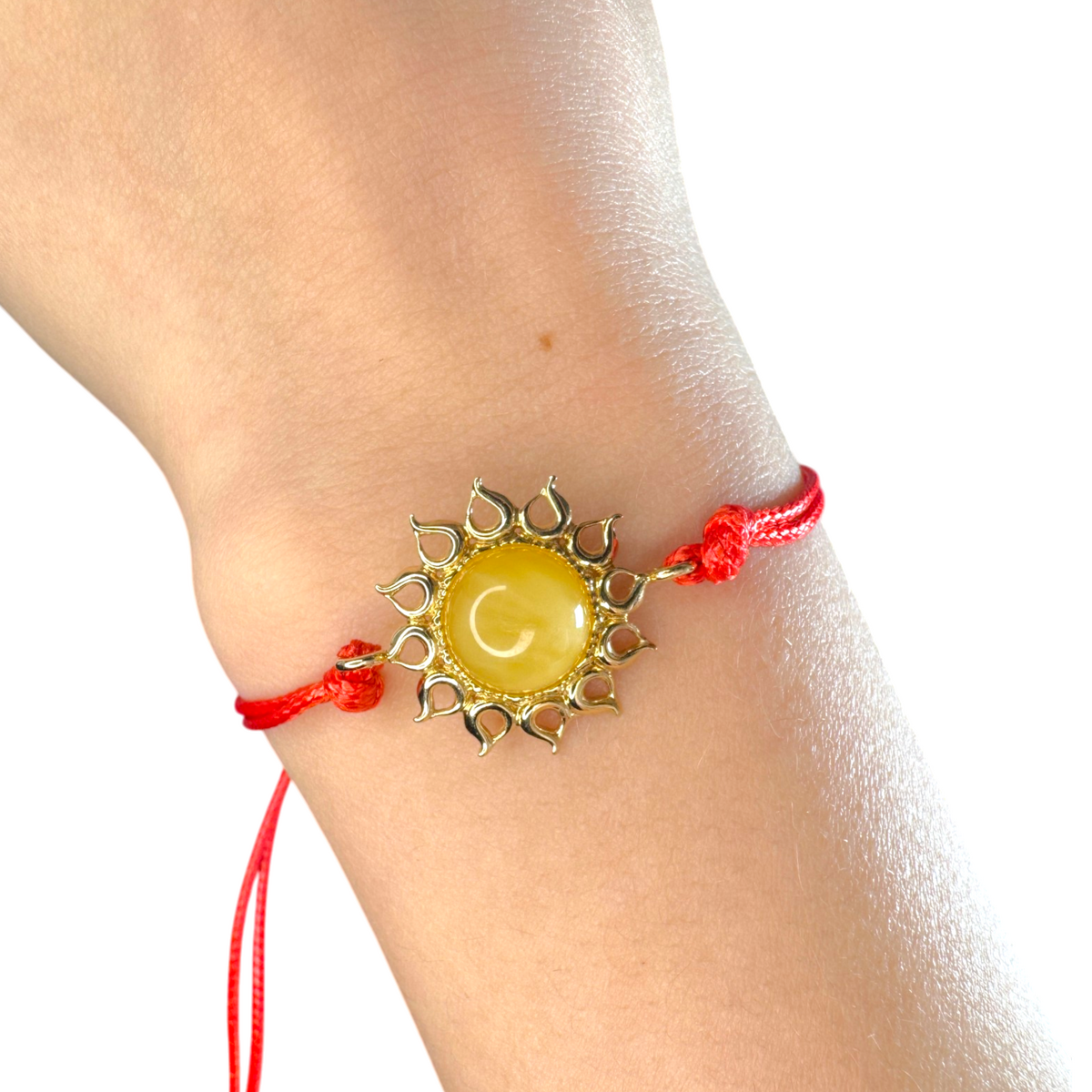 “Sun” Bracelet with Red Cord, Gold-Plated Silver Details & Natural Amber (Adjustable)