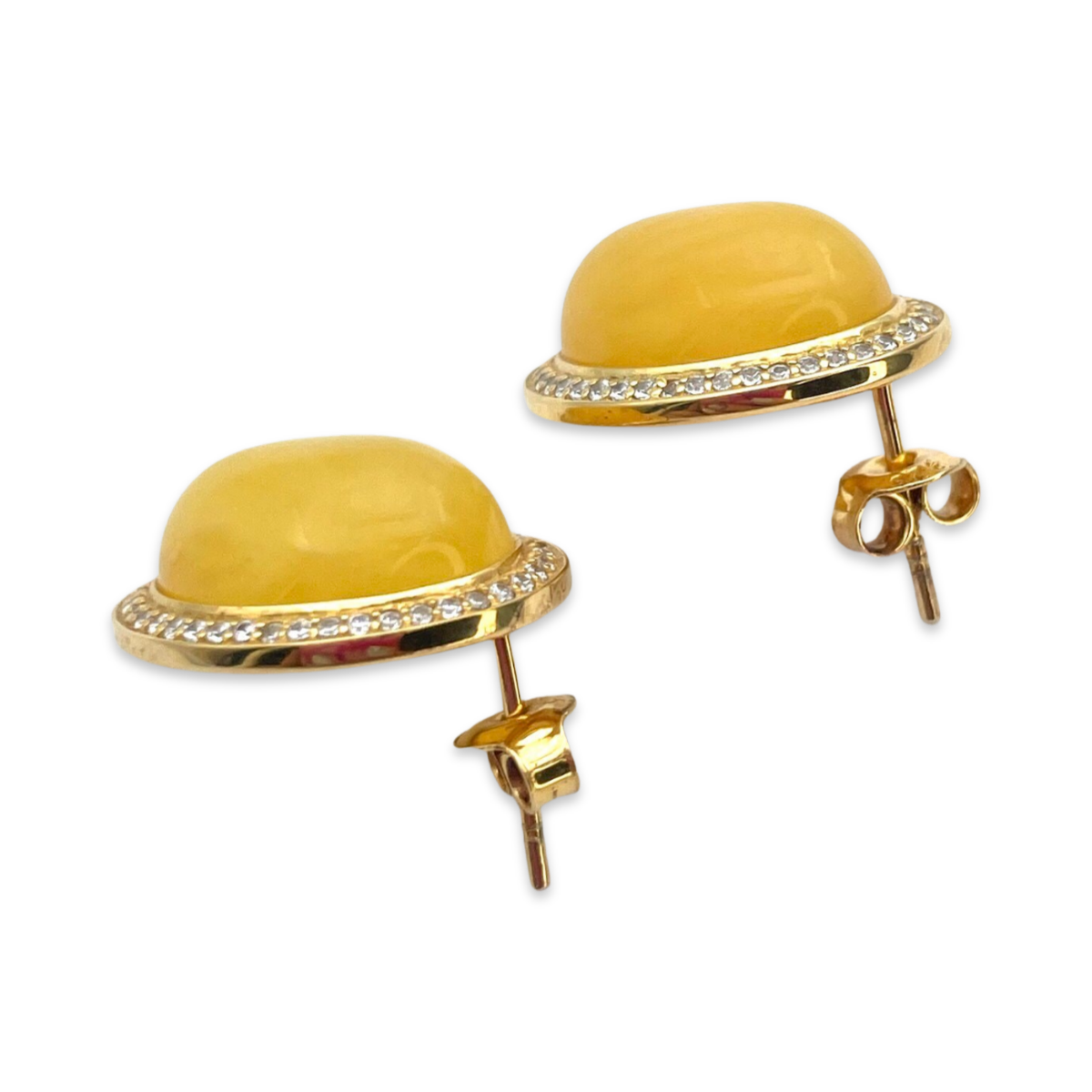 These gold-plated 24k stud earrings are a beautiful and elegant accessory that feature stunning amber and sparkling zircon stones. The earrings are made from high-quality gold-plated silver, which is both durable and stylish.The earrings feature two pieces of amber, which have been carefully polished to showcase their natural beauty. The warm, golden tones of the amber are complemented perfectly by the golden hues of the metal.The amber stones are surrounded by a border of sparkling zircon stones, which add a touch of glamour and sophistication to the earrings. The zircon stones are carefully set into the metal, creating a beautiful and seamless look.These stud earrings are the perfect accessory for any occasion, from a casual day out to a formal evening event. They are versatile and can be paired with a wide range of outfits, adding a touch of elegance and sophistication to your look. They are also lightweight and comfortable to wear, making them an ideal choice for everyday wear.Whether you're looking for a gift for someone special or want to treat yourself to a beautiful pair of earrings, these gold-plated stud earrings with amber and zircon stones are a great choice. They are a timeless and classic piece of jewelry that you will treasure for years to come.