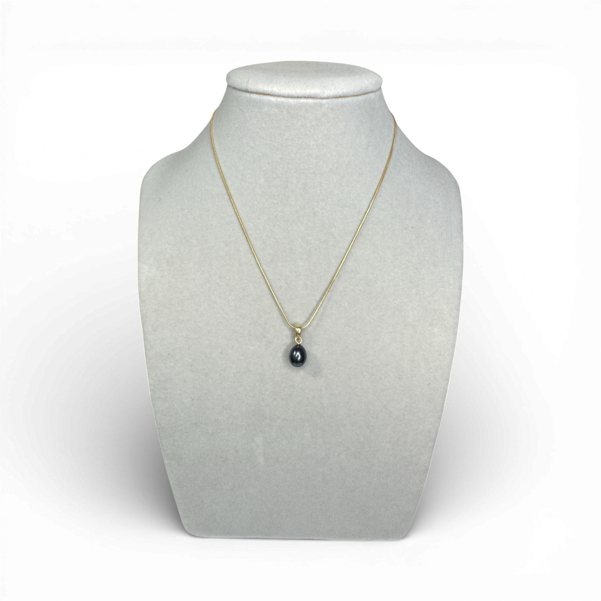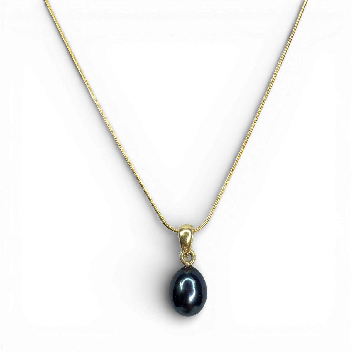 An elegant pendant crafted from gold-plated silver and finished with a deep black pearl. The rich tone and clean silhouette create a bold yet refined statement. Timeless, sophisticated, and effortlessly chic.